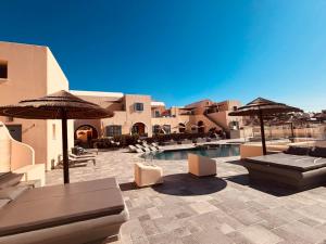 La superbe piscine est l’endroit idéal pour se détendre autour d’un petit-déjeuner fait maison, de collations et de boissons, tout en profitant d’une vue inoubliable sur le coucher de soleil unique de Santorin.