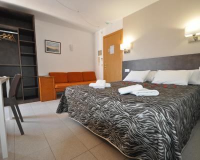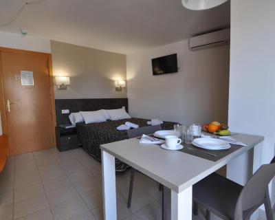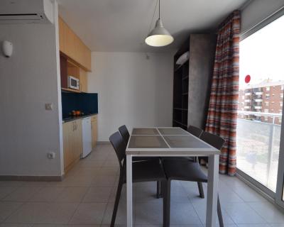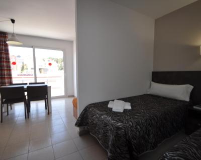 Each studio has a living area with a bed, sofa bed and a kitchen corner. *The aparthotel has different types of studios with different layouts but always with the same comfort.* This includes a ceramic hob, toaster and kettle. Apartments have separate sleeping and living areas. Towels are changed and accommodation is cleaned regularly.