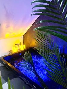 L’établissement Saphir Spa - Sauna Balnéo Chromothérapie Massage comprend un espace bien-être contenant un sauna et un bain à remous.