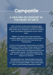 Notre hôtel se transforme en Campanile PRIME, notre nouveau label plus élégant, plus connecté et plus axé sur le sport ! Vous pourrez vous reposer pendant les travaux de rénovation : nous faisons tout notre possible pour réduire les perturbations au minimum.