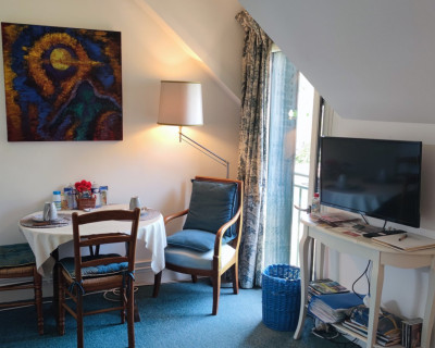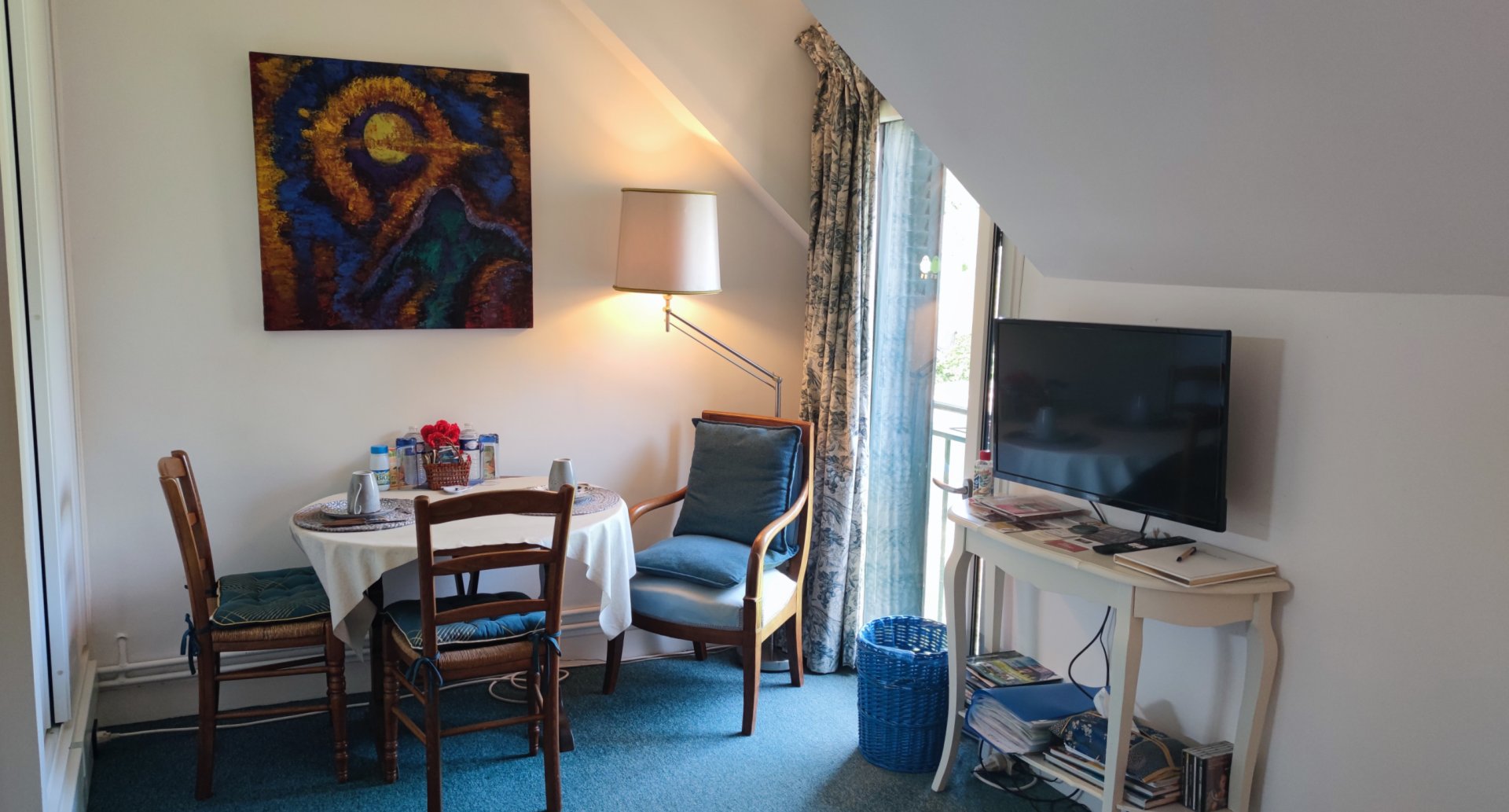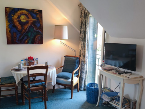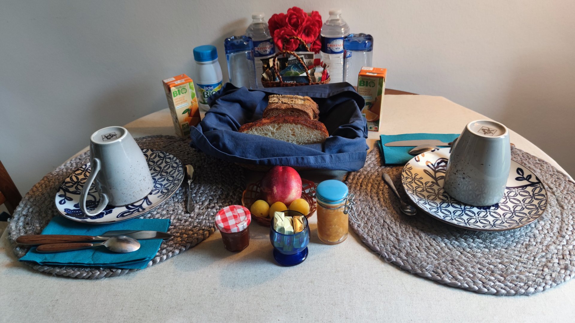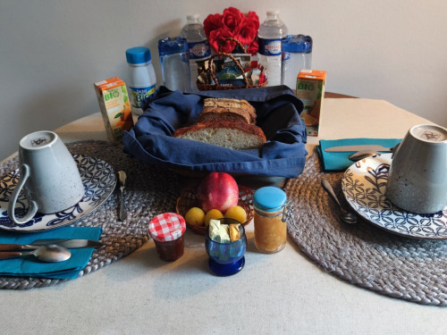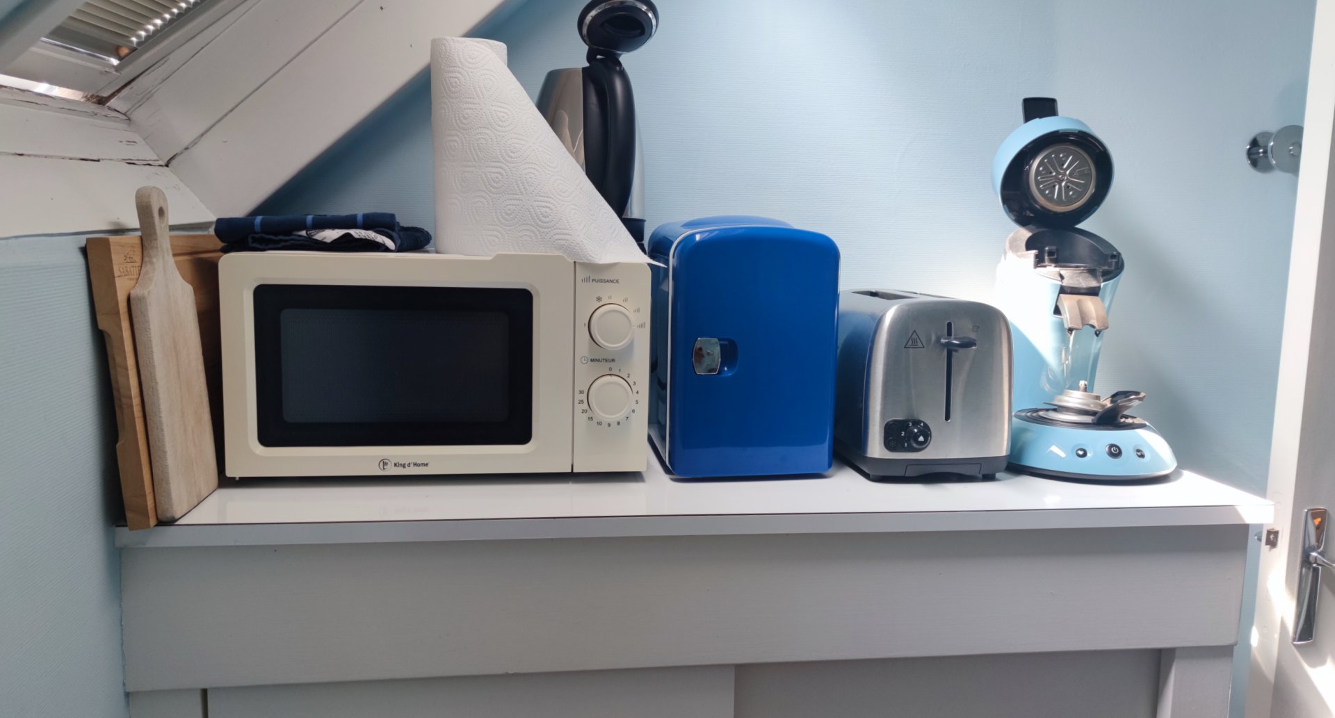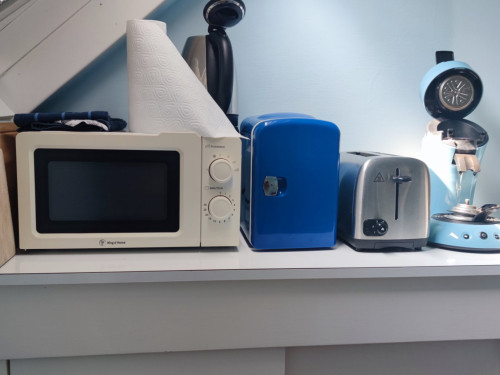 S'y trouve le nécessaire pour faire le café, bouilloire, grille-pain, mini frigidaire et four micro-ondes. Vaisselle nécessaire à un repas réchauffé, si besoin, une glacière électrique.