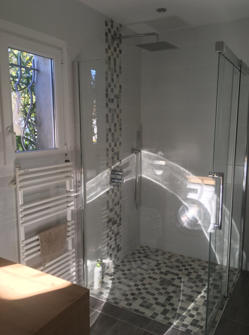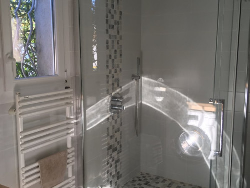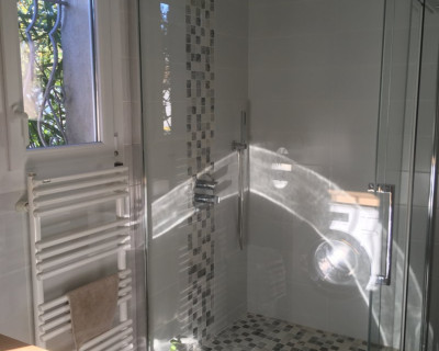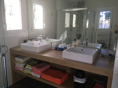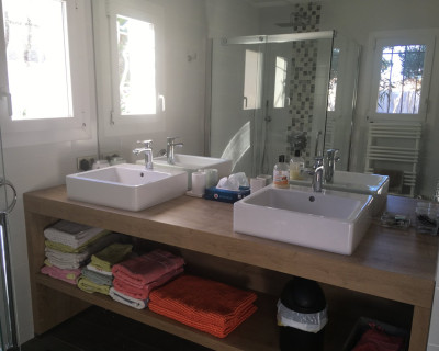 La salle de bains est grande avec deux vasques, une cabine douche de plain-pied.