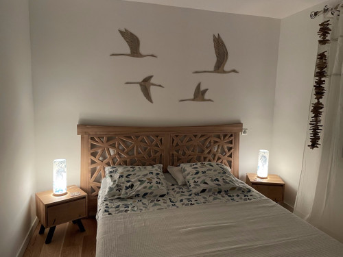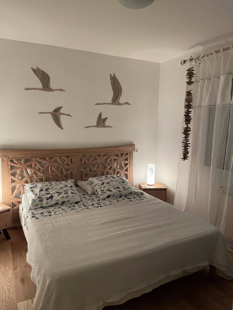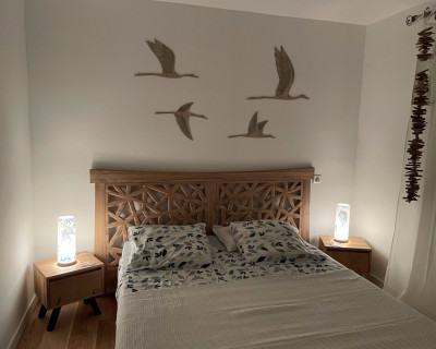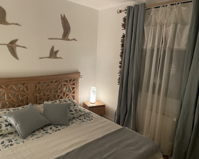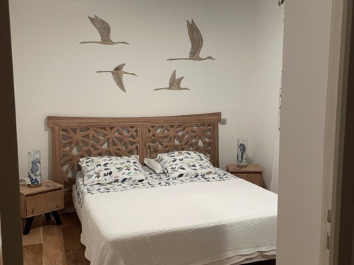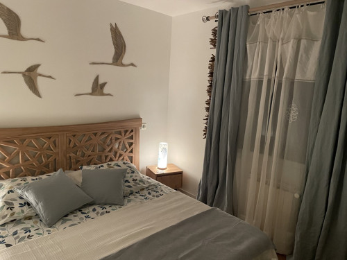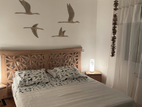 La chambre de 12 m² dispose d'un grand lit pour 2 personnes, un placard, deux chevets, et un ventilateur au besoin, elle est à l'arrière de la maison et donc plutôt fraîche.