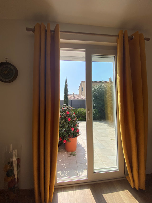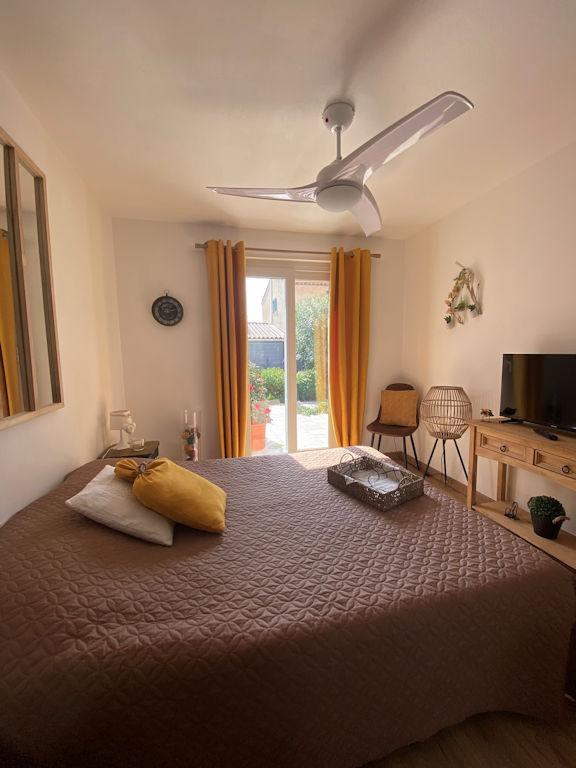 La chambre d’hôte se compose d’une chambre donnant sur une terrasse plein sud ; en traversant et de l’autre côté, une cuisine et la salle de bain donnant sur une autre terrasse côté nord pour moins de chaleur, à l’ombre.