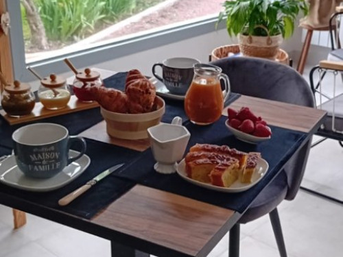 Le petit déjeuner très copieux est préparé avec des produits faits maison entre autres cake, confitures et miel du producteur (Mr. Rioland).