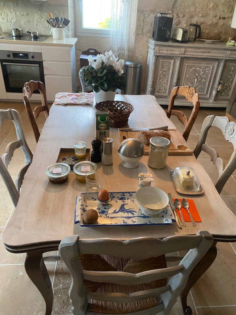 Petit déjeuner bio avec produits maison: confiture, yaourt, pâtisserie , œufs coque et fruits si saison.