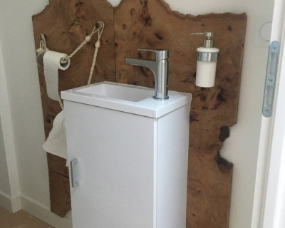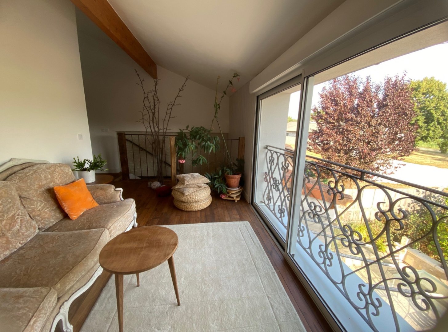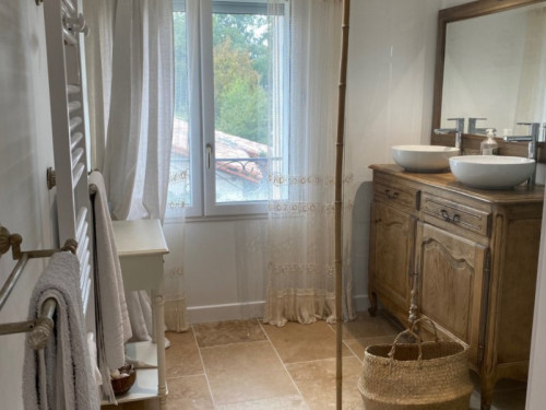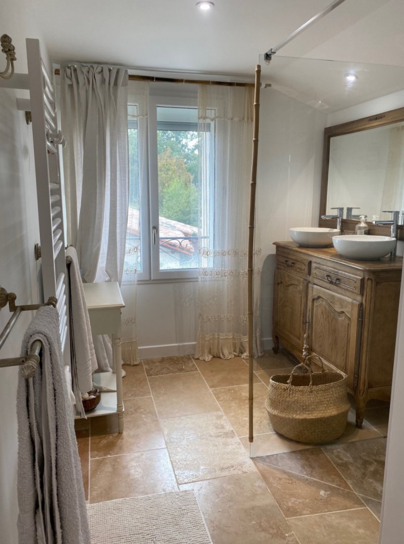 A l'étage : 2 grandes chambres ,1 lit 160, 1 lit 140, SDD partagée avec double vasques, douche italienne; WC avec lave mains séparés, mezzanine salon bibliothéque avec vue sur l'aurore et crépuscule.