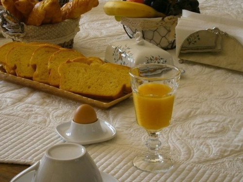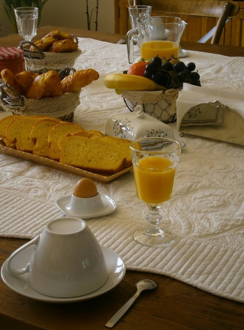 Les petits déjeuners sont servis dans la salle à manger largement ouverte sur le jardin ou sur la terrasse aux beaux jours si le temps le permet.