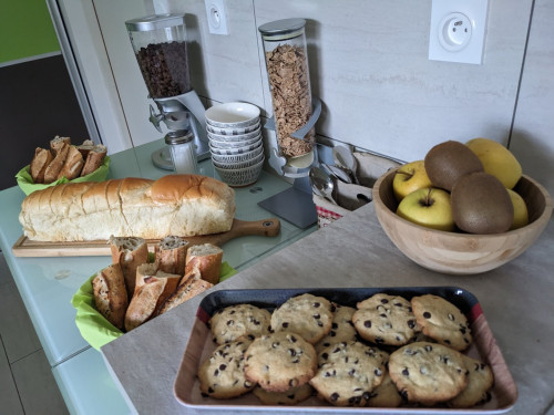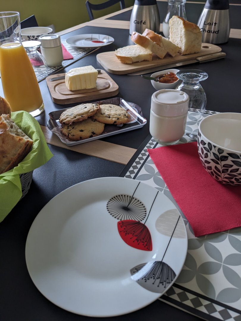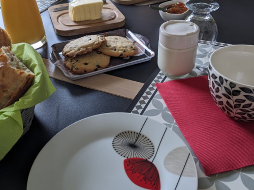 De supers bons petits déjeuners, variés avec ses petits gâteaux, yaourts et confitures maison.
