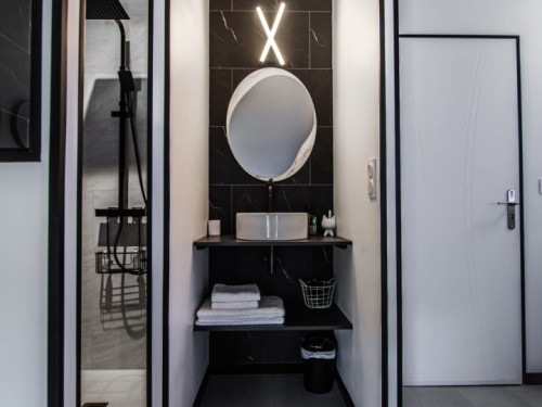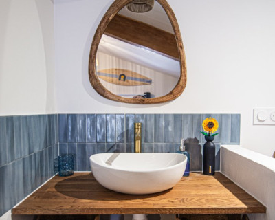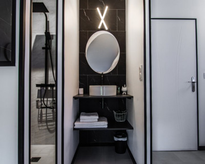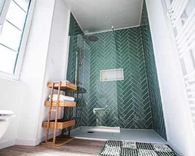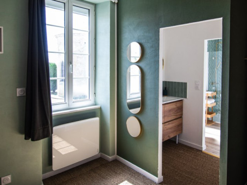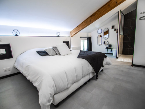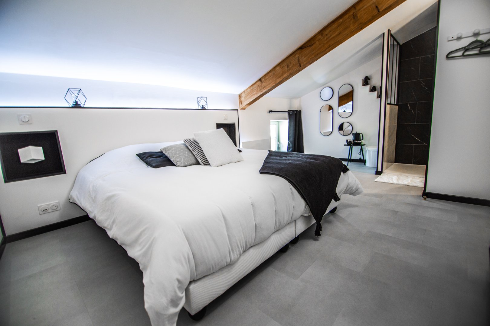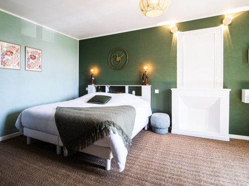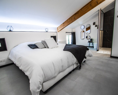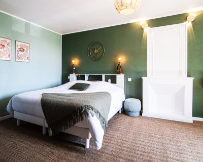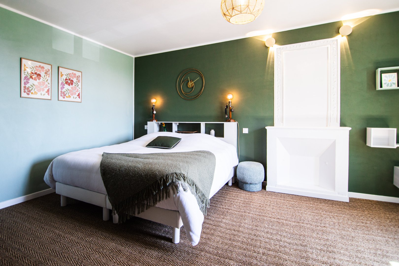 Laissez-vous envelopper par une ambiance douce et harmonieuse, où le vert olive se mêle aux touches dorées pour une atmosphère chaleureuse et sophistiquée. L’Oliverne est une chambre au caractère unique, inspirée de la nature, alliant modernité et confort absolu.