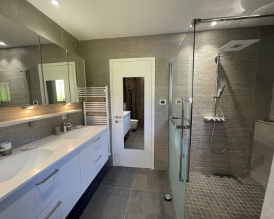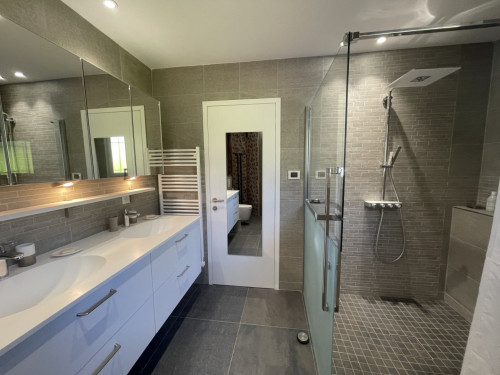 La Salle d'Eau comprend un meuble 2 vasques, une douche à l'italienne haut de gamme, WCs, placard avec fer et table à repasser et étendage.