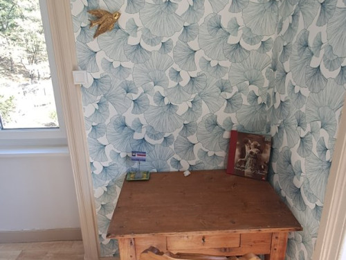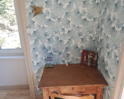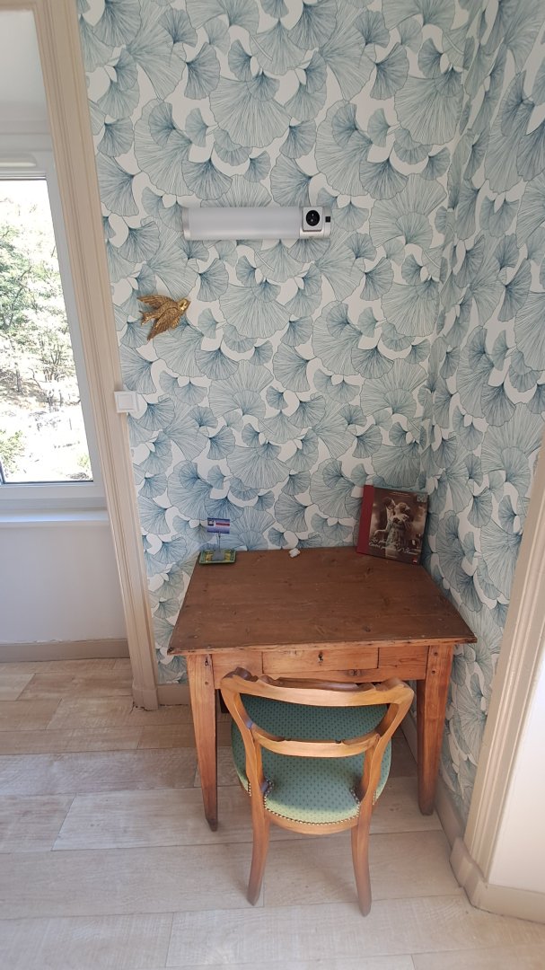 Plongez dans l’atmosphère douce et apaisante de cette chambre d’hôtes, où le charme de l’ancien se marie à la fraîcheur d’une décoration inspirée de la nature. Les meubles en bois sculpté, soigneusement conservés, racontent l’histoire d’un savoir-faire artisanal, tandis que le papier peint aux motifs de feuilles crée une ambiance sereine et lumineuse.