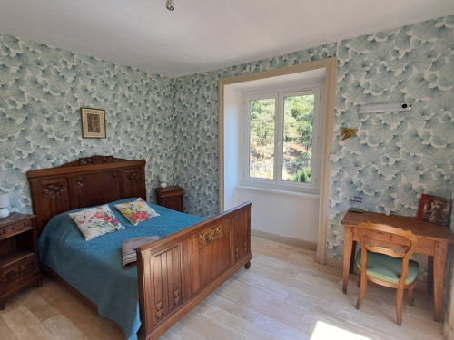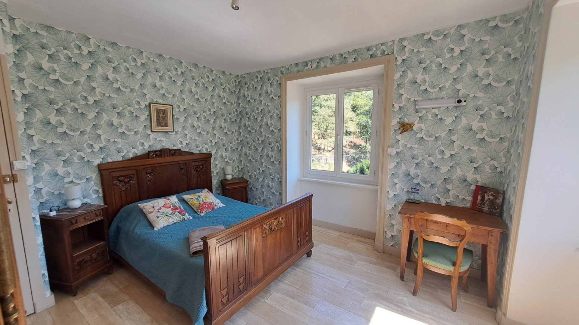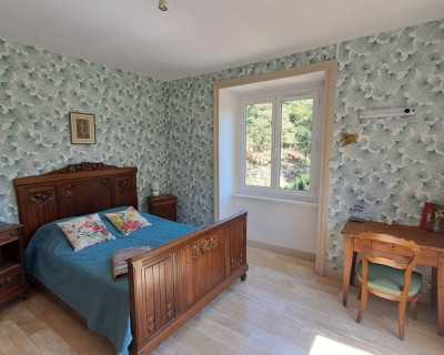 Équipée d’un lit double confortable, d’un petit bureau ancien et de tables de chevet assorties, la chambre offre tout le confort nécessaire pour un séjour ressourçant. Les grandes fenêtres baignent la pièce de lumière naturelle et ouvre sur une vue verdoyante, invitant à la détente.
