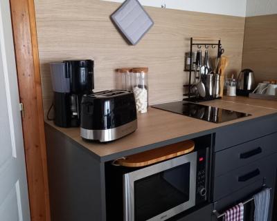 Salle de bains, petit coin cuisine et grand lit pour 2 personnes au rez-de-chaussée.