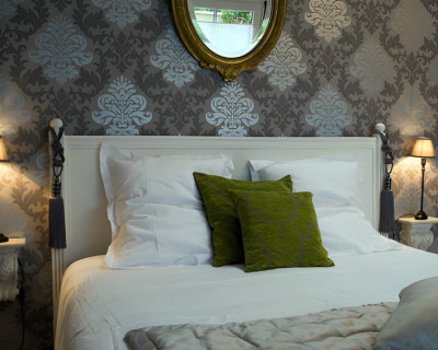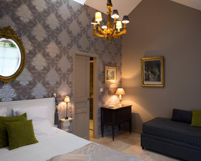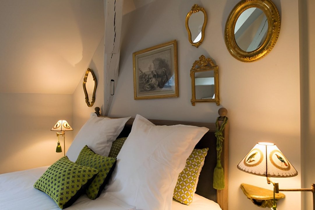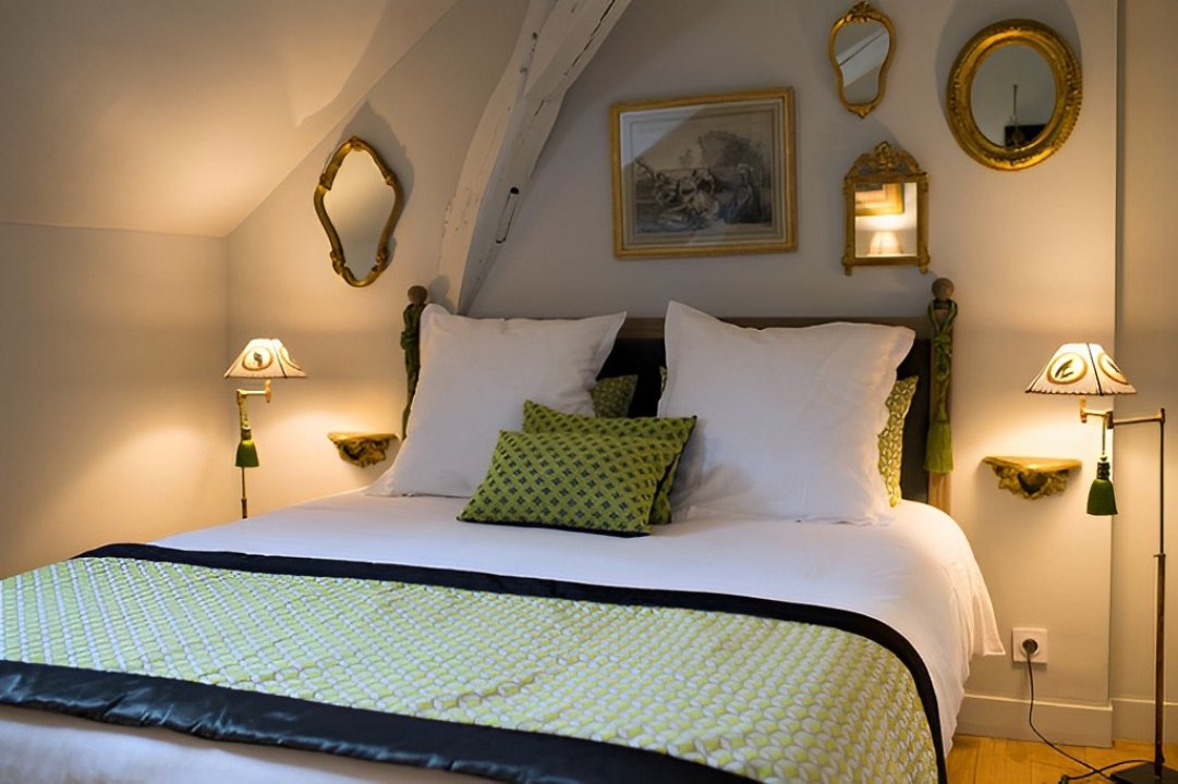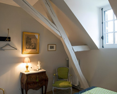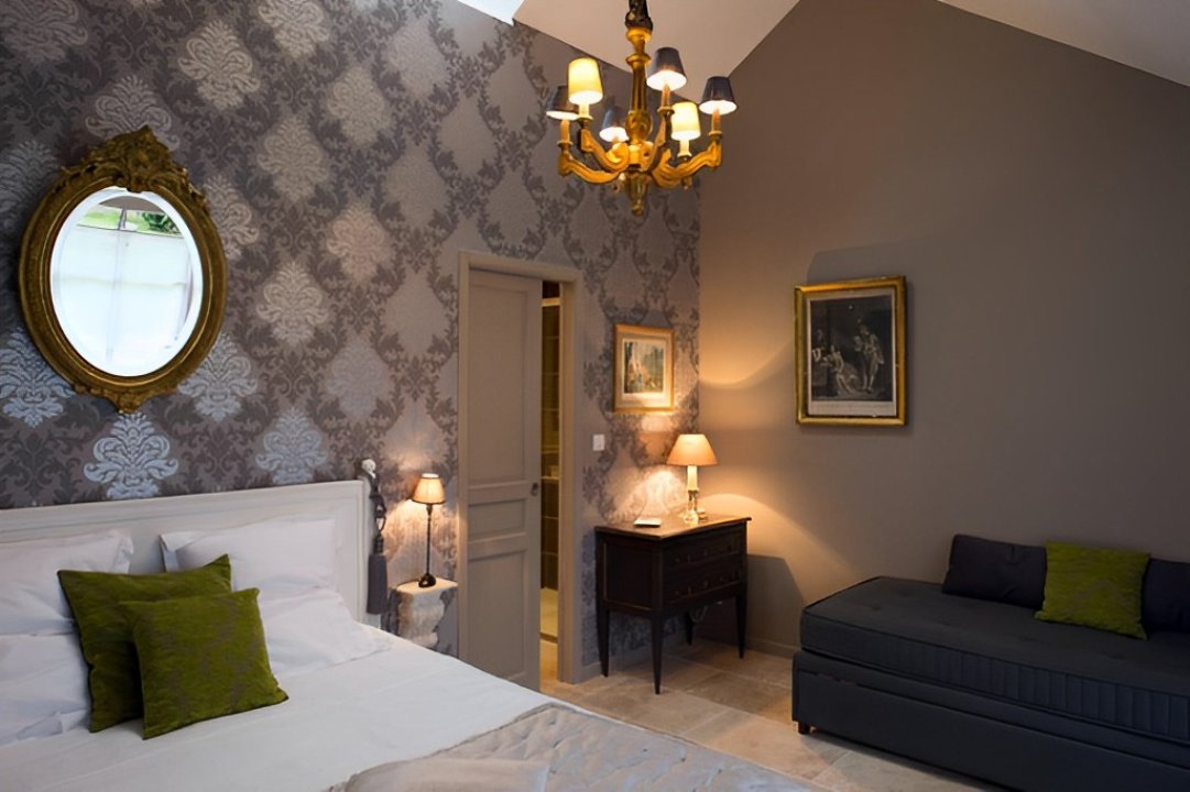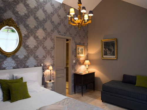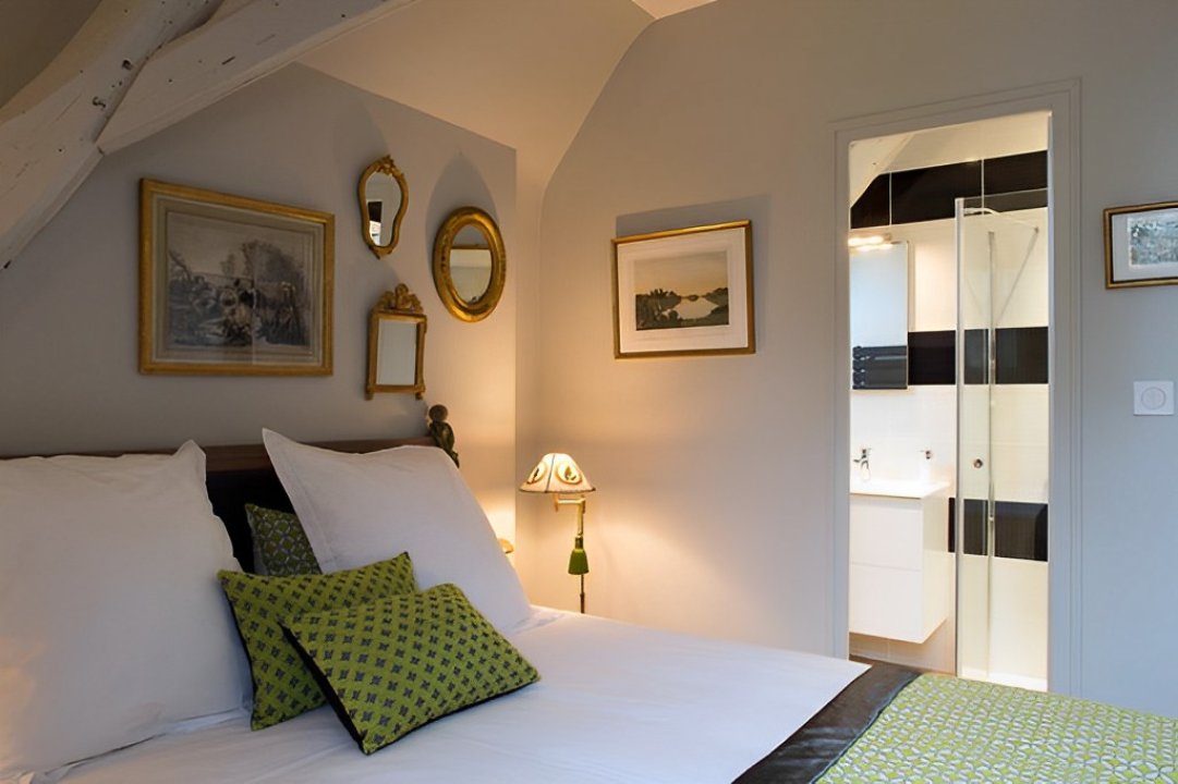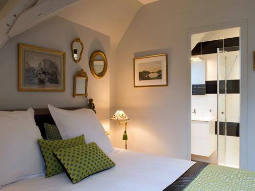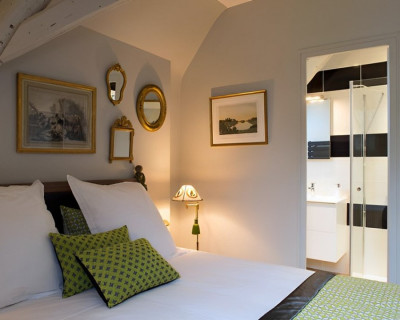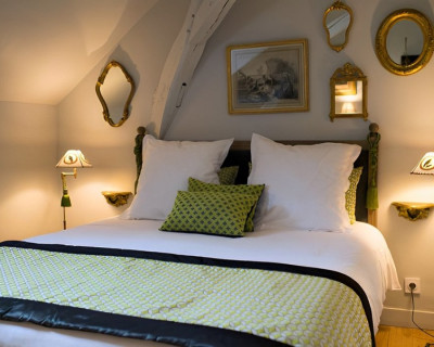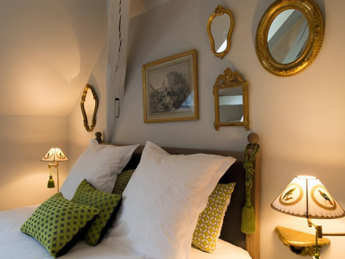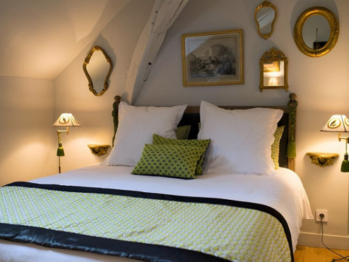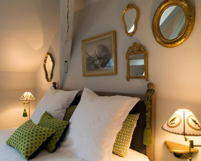 C'est la plus petite chambre de la maison. Les gravures et miroirs dorés lui apportent un coté précieux, le vert franc des fauteuils, chemin de lit, coussin et passementeries ajoutent une touche de fantaisie et de modernité.