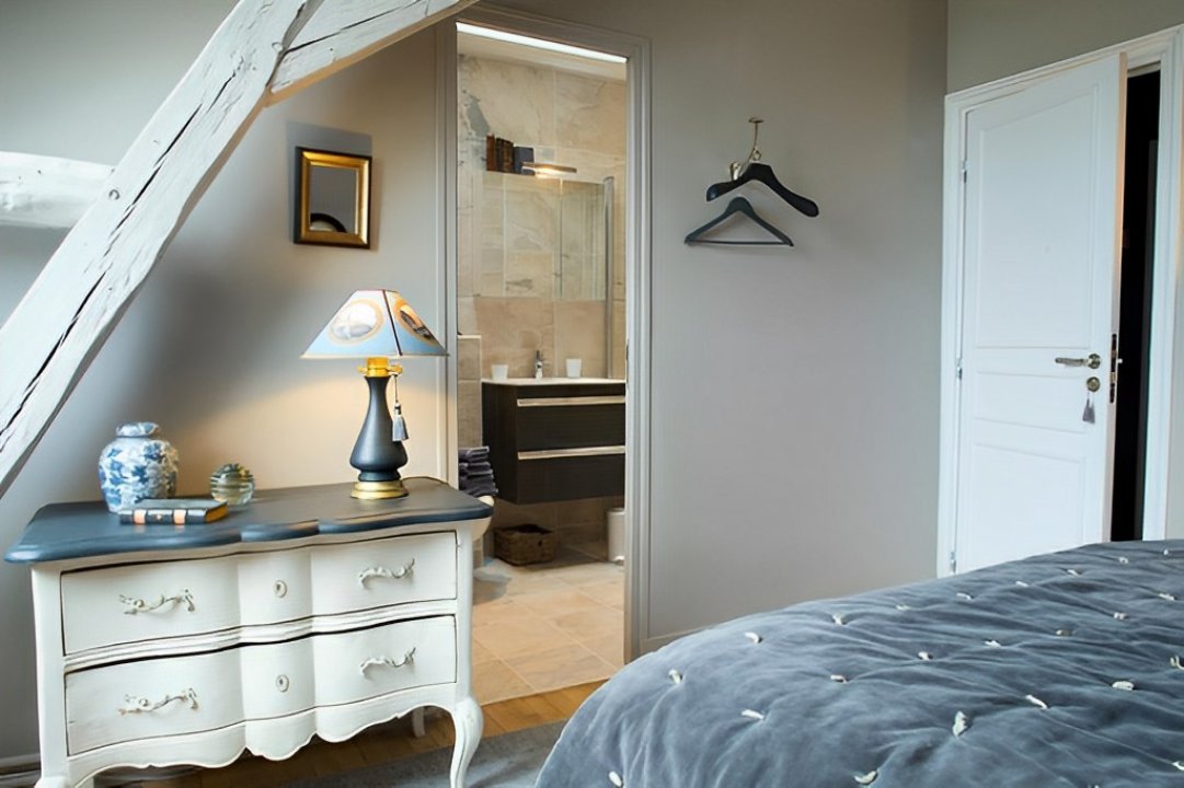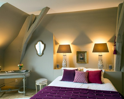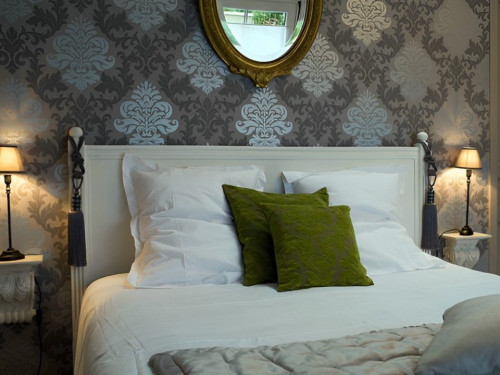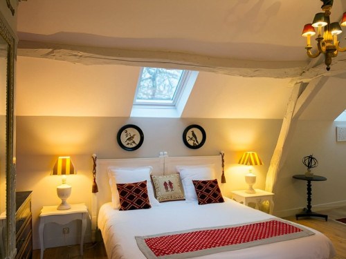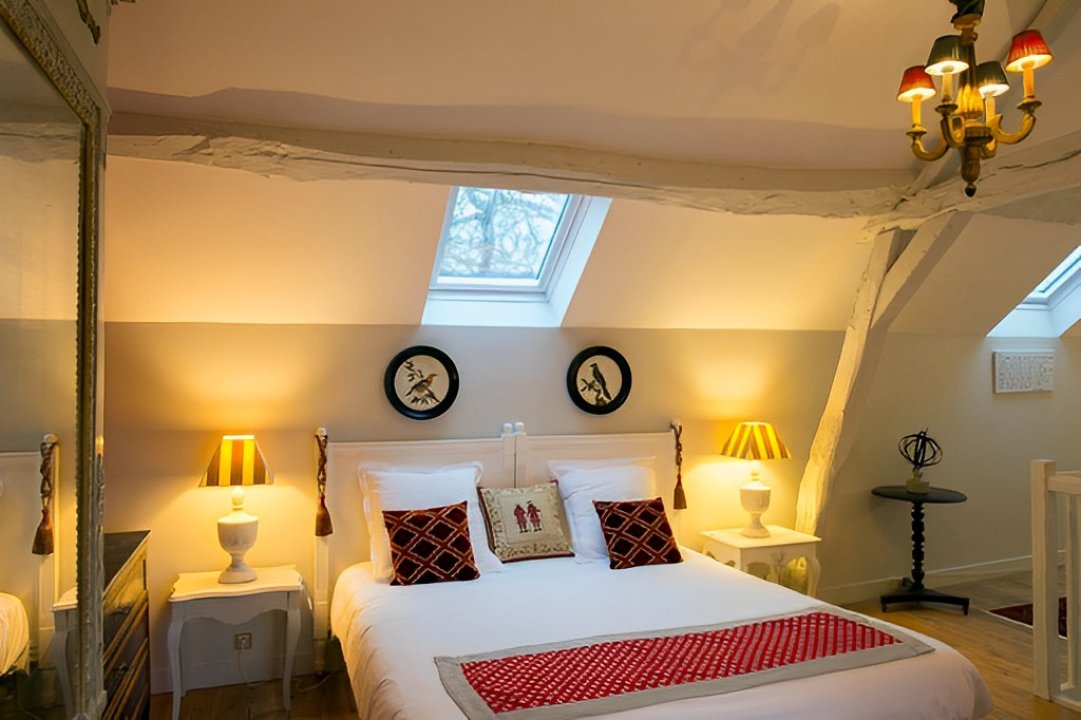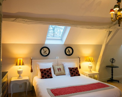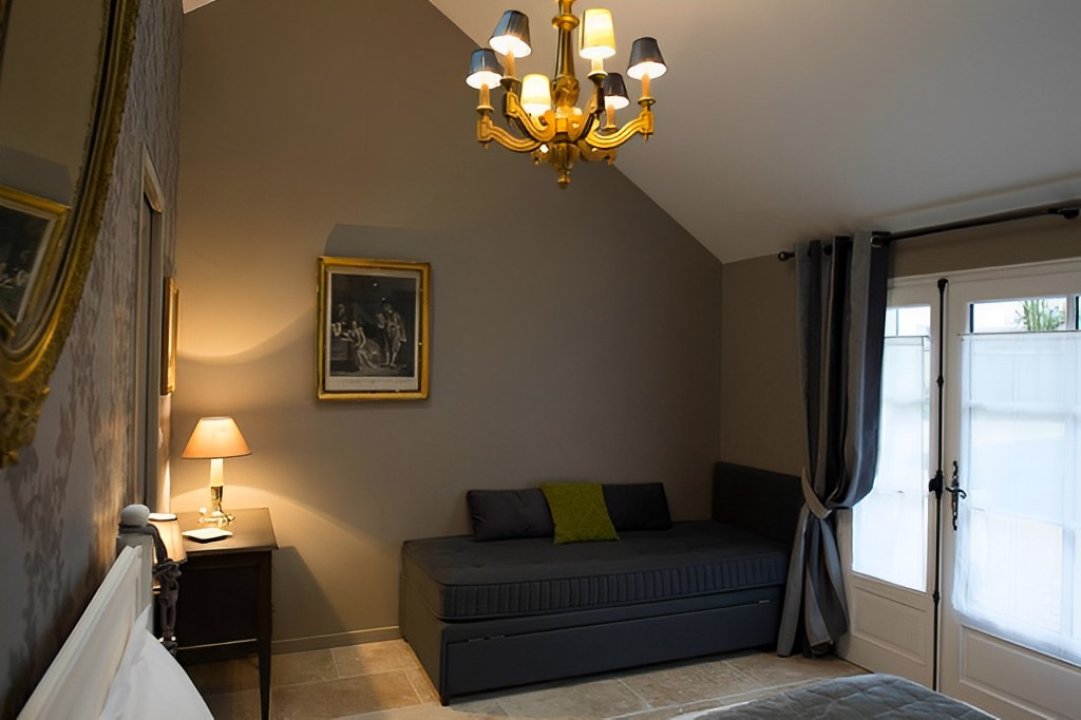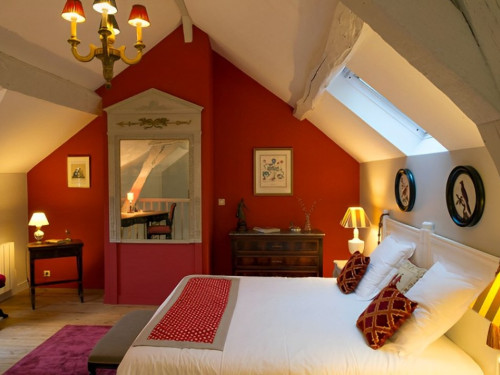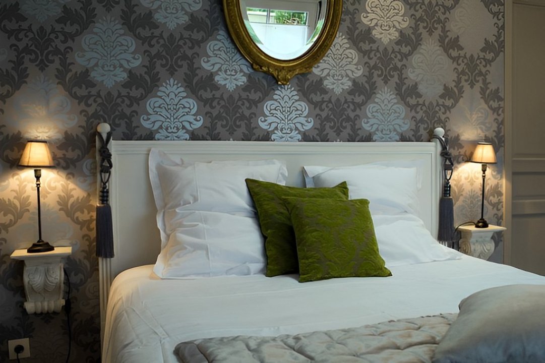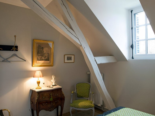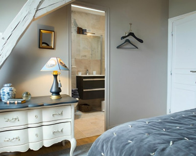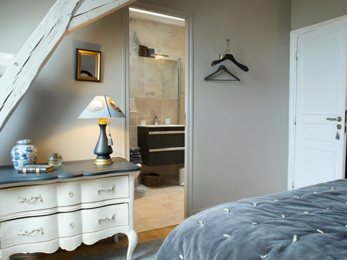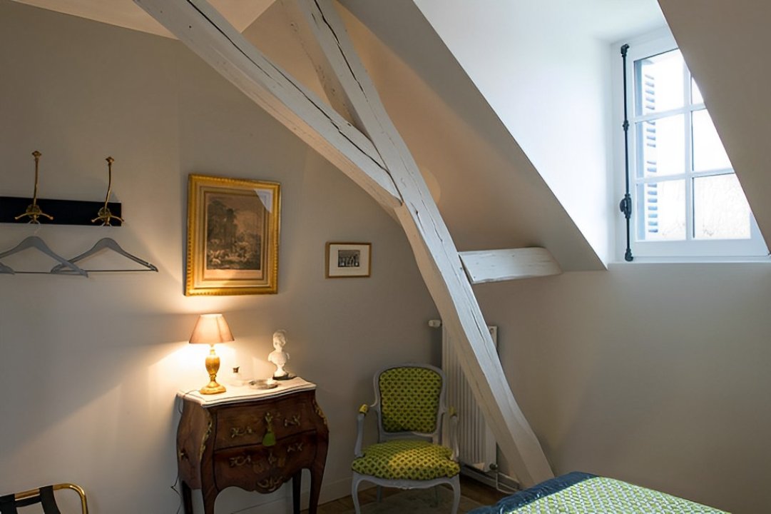C'est la plus petite chambre de la maison. Les gravures et miroirs dorés lui apportent un coté précieux, le vert franc des fauteuils, chemin de lit, coussin et passementeries ajoutent une touche de fantaisie et de modernité.