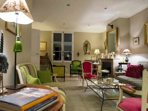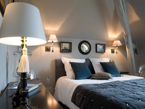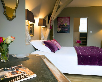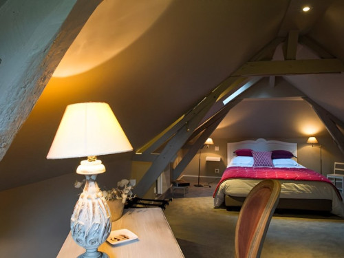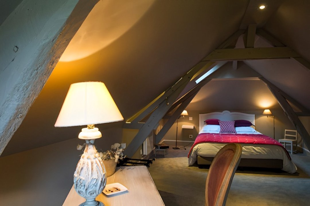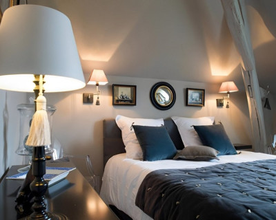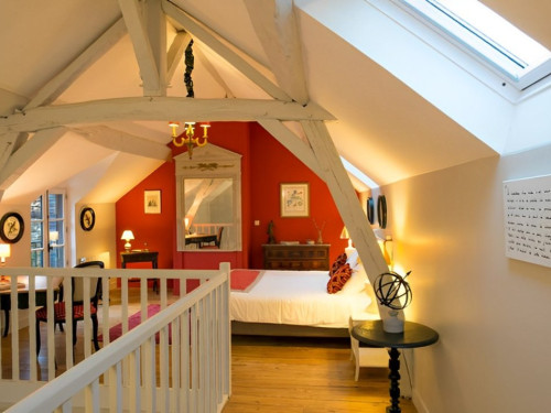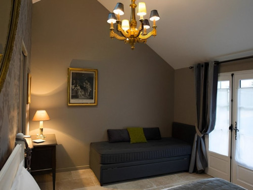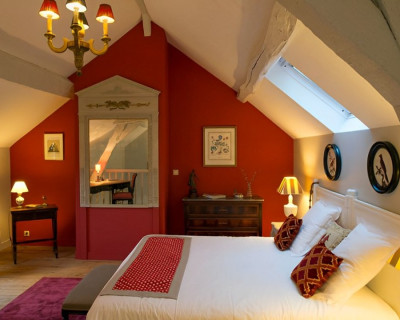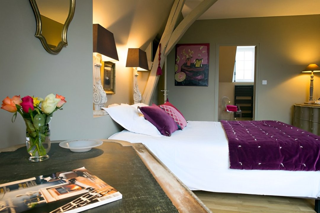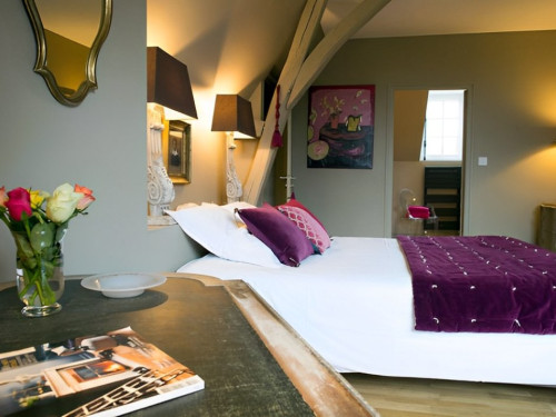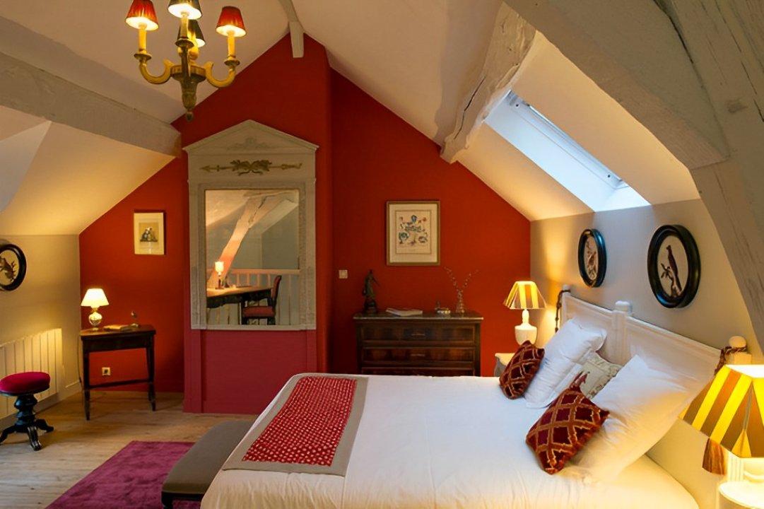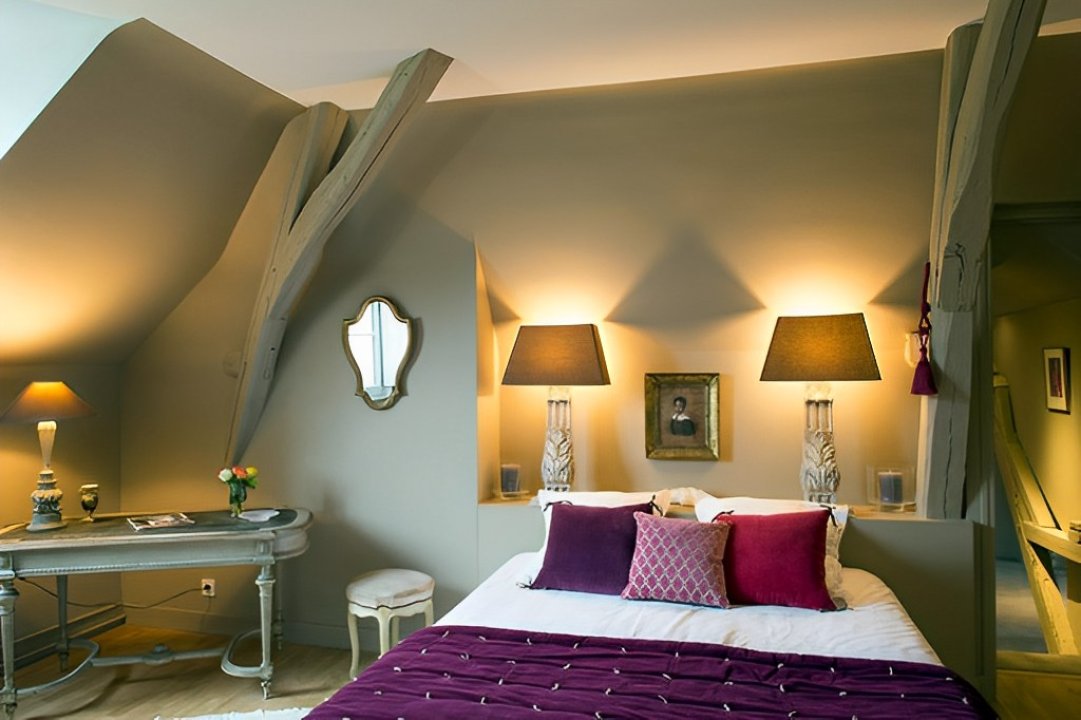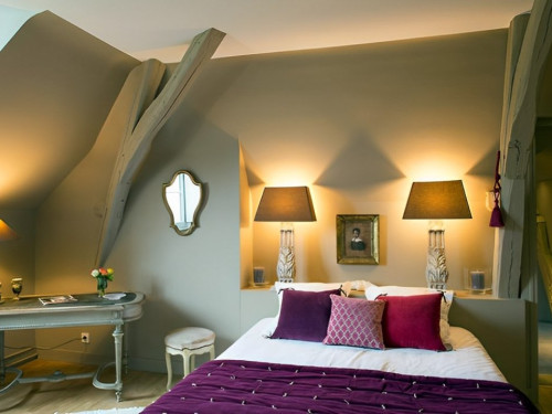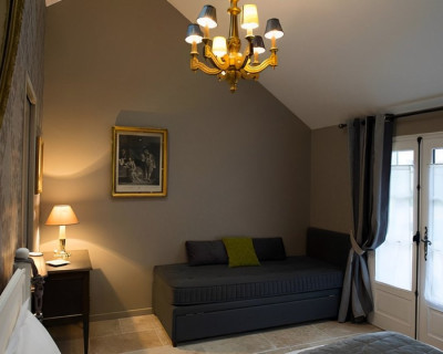 C'est la plus petite chambre de la maison. Les gravures et miroirs dorés lui apportent un coté précieux, le vert franc des fauteuils, chemin de lit, coussin et passementeries ajoutent une touche de fantaisie et de modernité.
