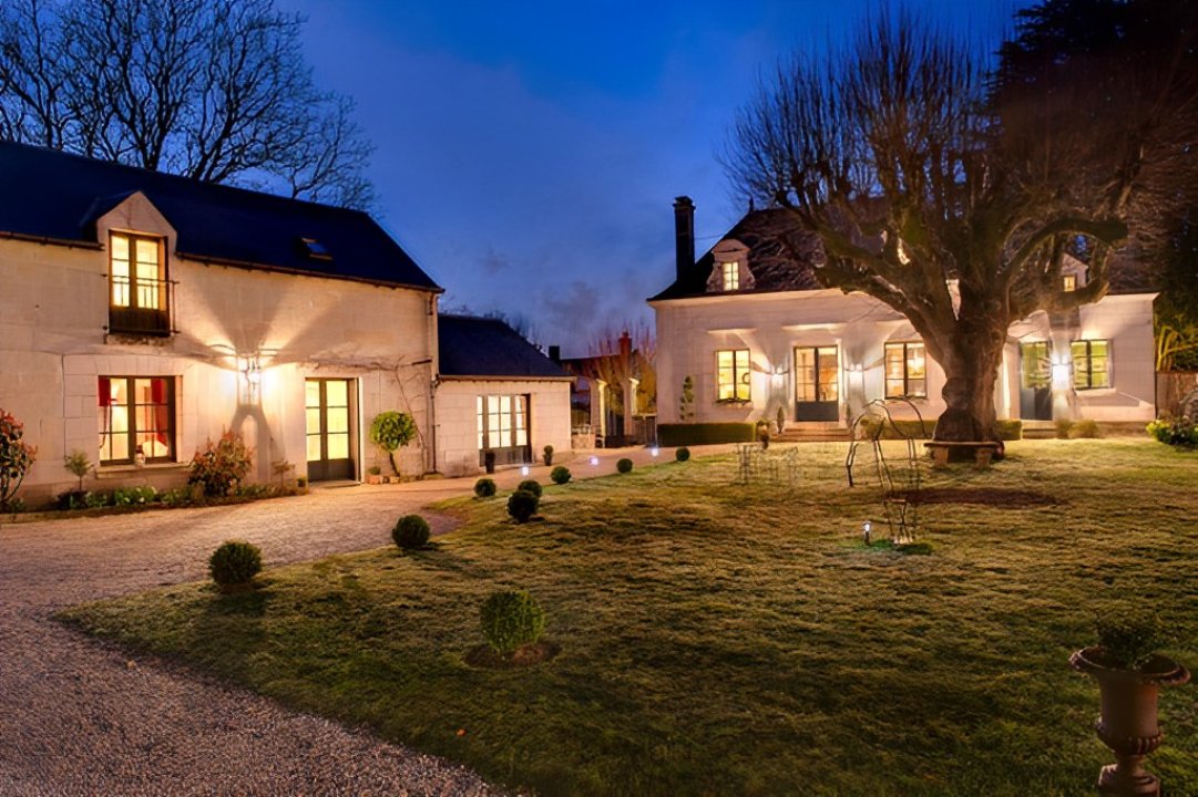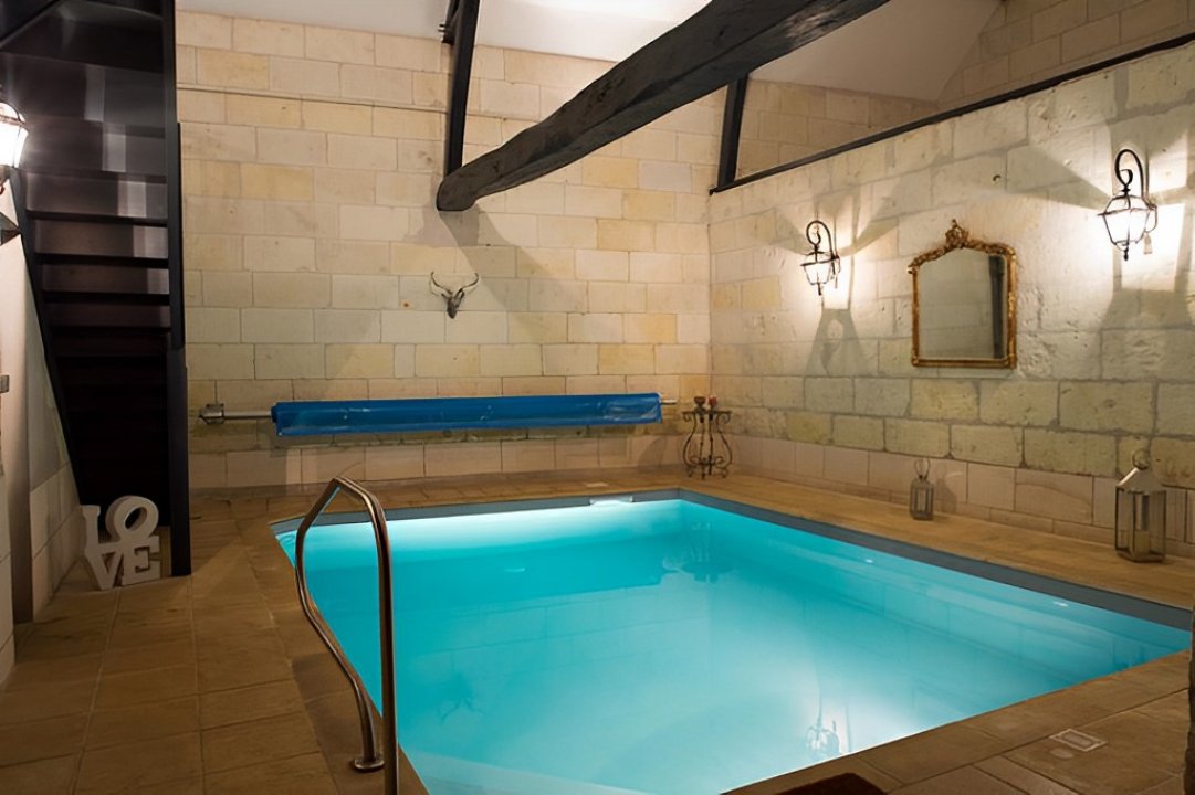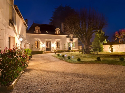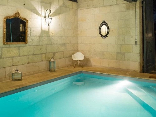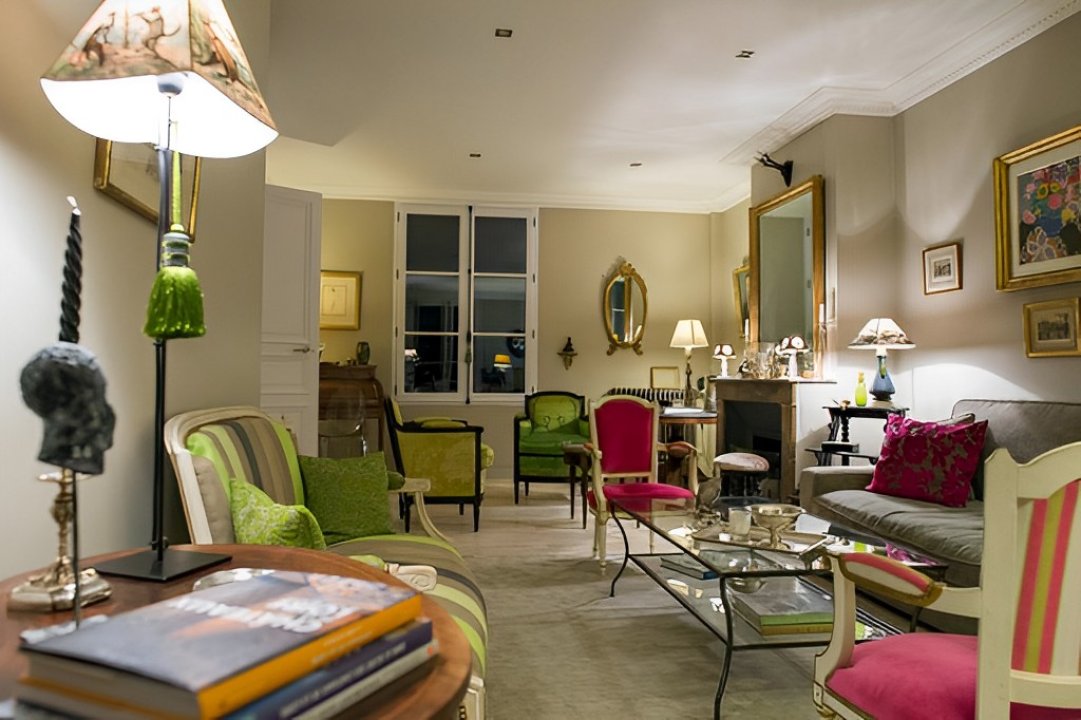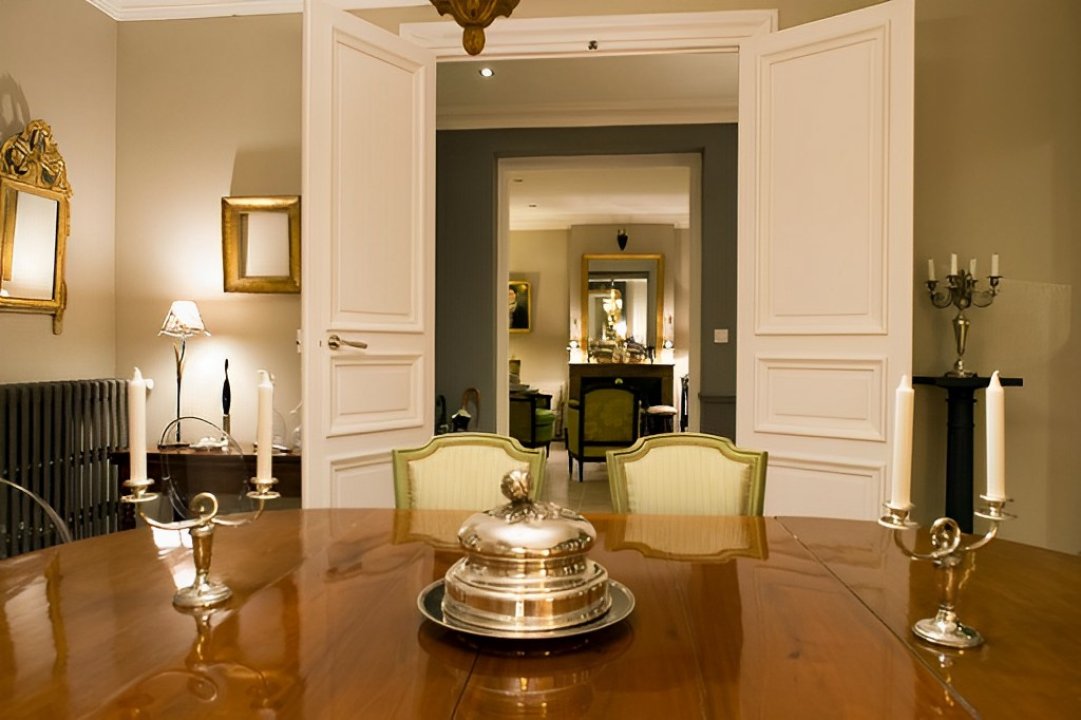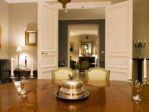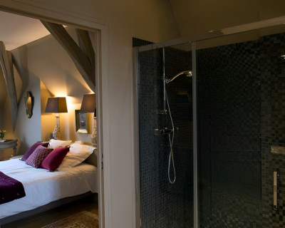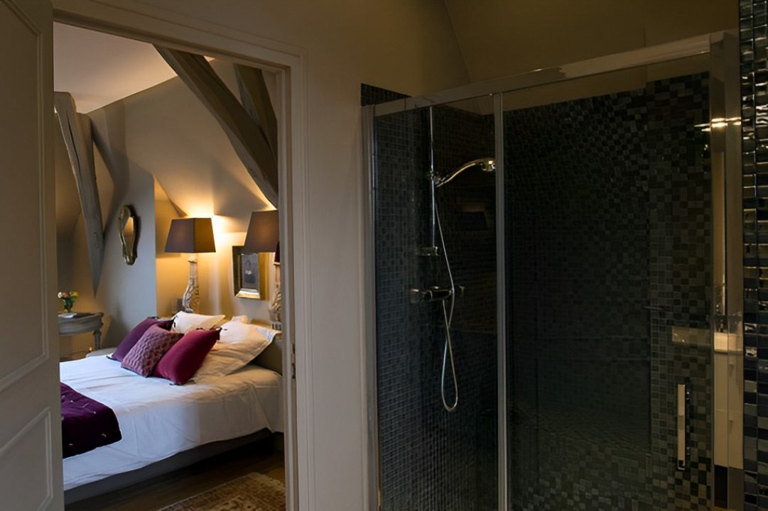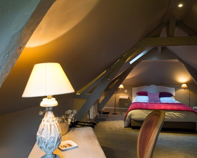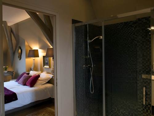 C'est la plus petite chambre de la maison. Les gravures et miroirs dorés lui apportent un coté précieux, le vert franc des fauteuils, chemin de lit, coussin et passementeries ajoutent une touche de fantaisie et de modernité.