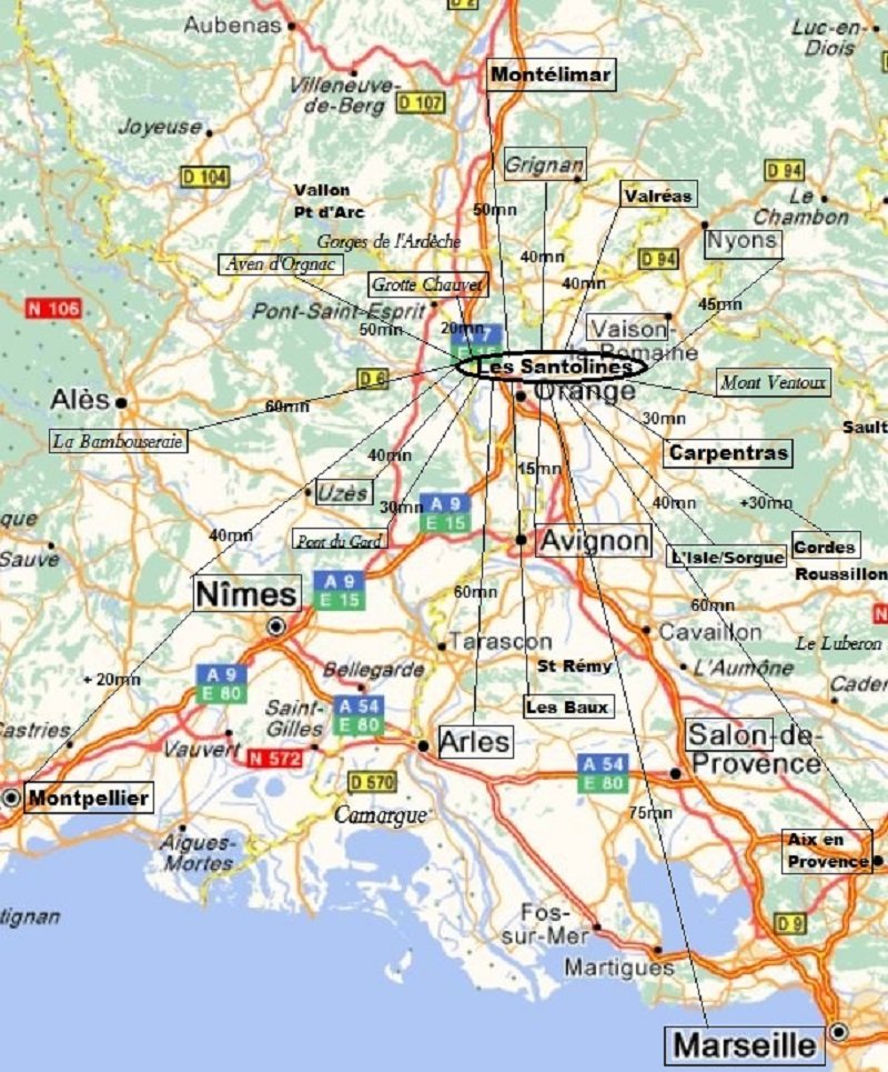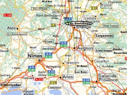 Notre situation géographique, proche à la fois de l'A7 et de l'A9, vous permet d'accéder rapidement aux principaux sites touristiques qui nous entourent, que votre intérêt se porte sur les ruines romaines, les villages perchés, les paysages provençaux ou les vignobles de Côtes-du-Rhône.