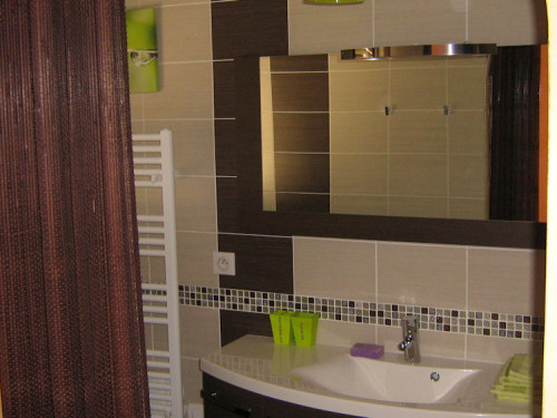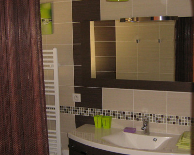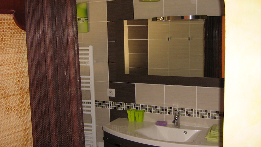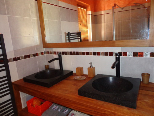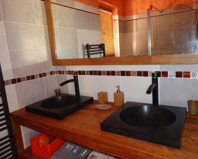 Sa somptueuse salle de bains comporte deux lavabos et une grande douche hydro-massante à l'italienne. Les toilettes sont séparées et agrémentées d'un lave-mains avec eau chaude. Nous pouvons y installer sur demande une table à langer.