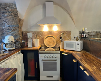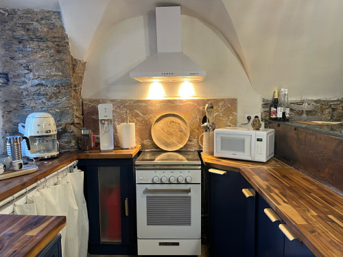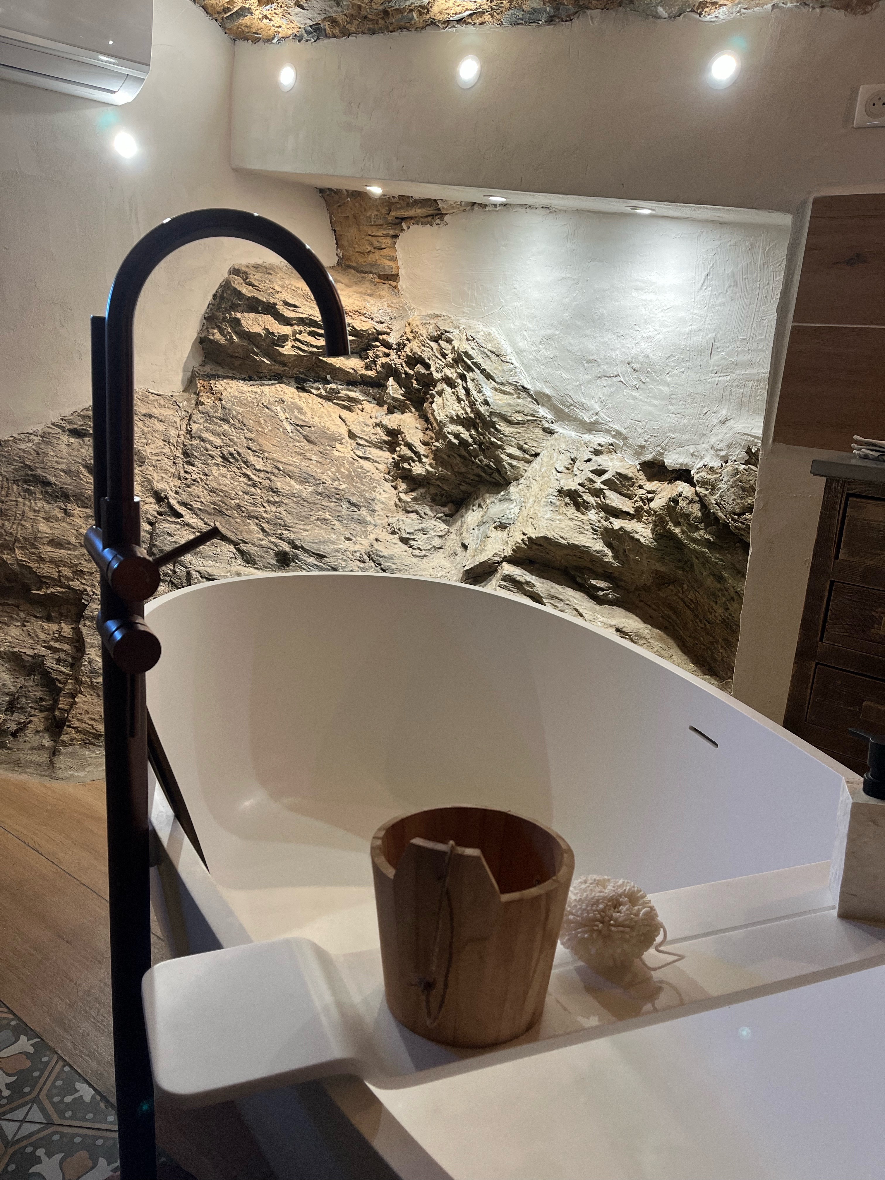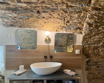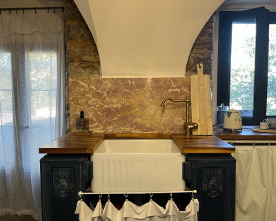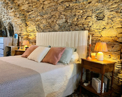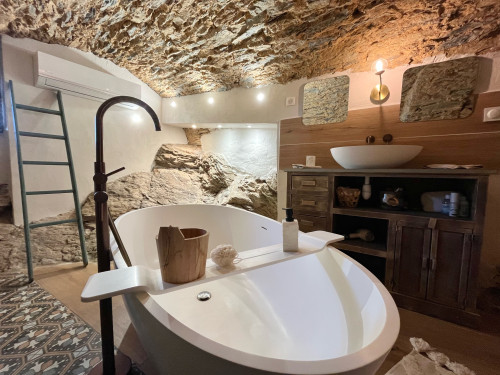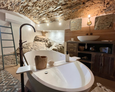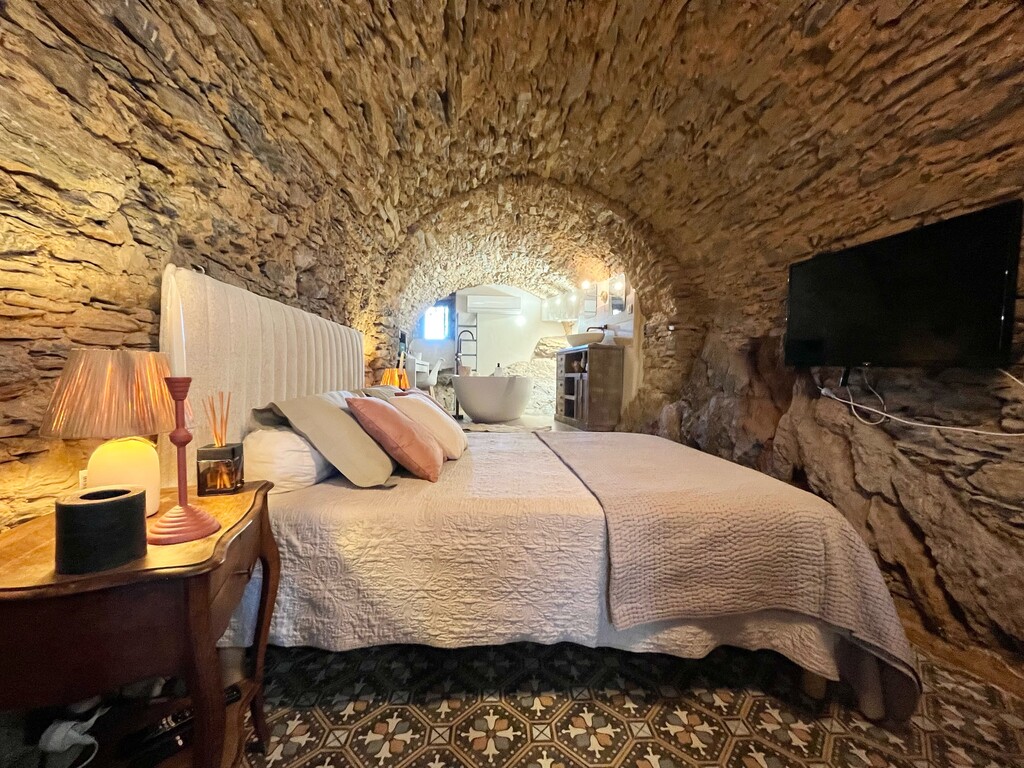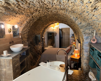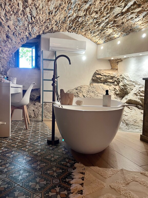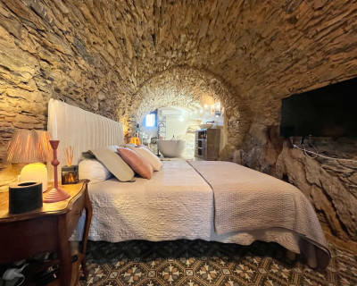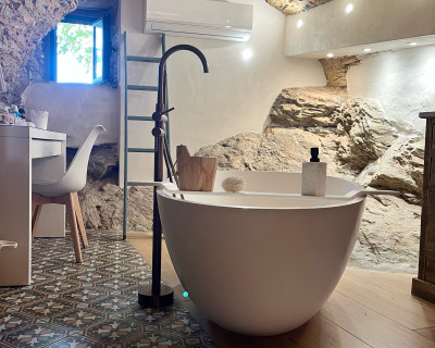 La chambre appart Ciucciarella est située dans l'ancienne étable de la maison. elle possède,un balcon, une cuisine équipée ouverte sur un salon, une chambre/dressing/salle de bain, un WC séparé. c'est un appartement de charme aux plafond voûtés, aux murs en pierres sèches et un rocher naturel qui font de ce cocon un endroit unique et atypique. il y a 2 TV écran plat, la climatisation dans l'espace nuit.