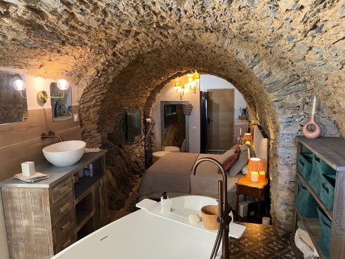 une grande suite composée d'un salon TV écran plat, une chambre et une spacieuse salle de bain avec baignoire rétro. elle vous offre l'espace et le confort d'un appartement. Vue sur le village et une jolie ruelle. Possibilité d’ajouter un lit bébé.