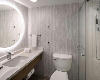 Accommodations feature a seating area with a sofa, small refrigerator, and microwave at the Clearwater Beach Marriott Resort on Sand Key Sand Key. Guests can enjoy views of Clearwater Bay from their suite's private balcony.