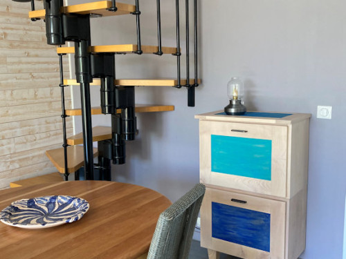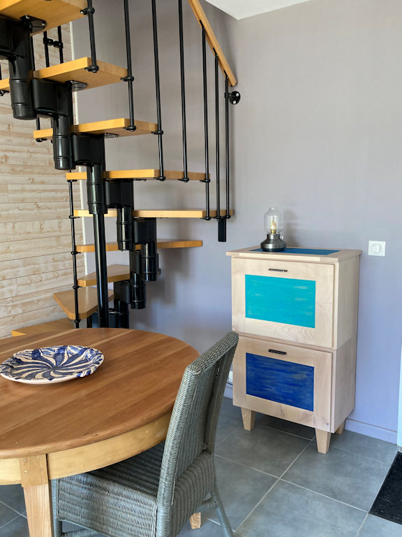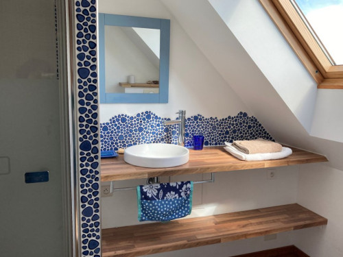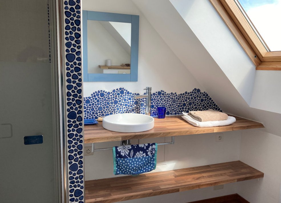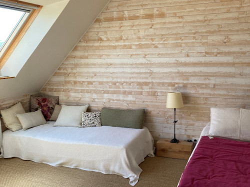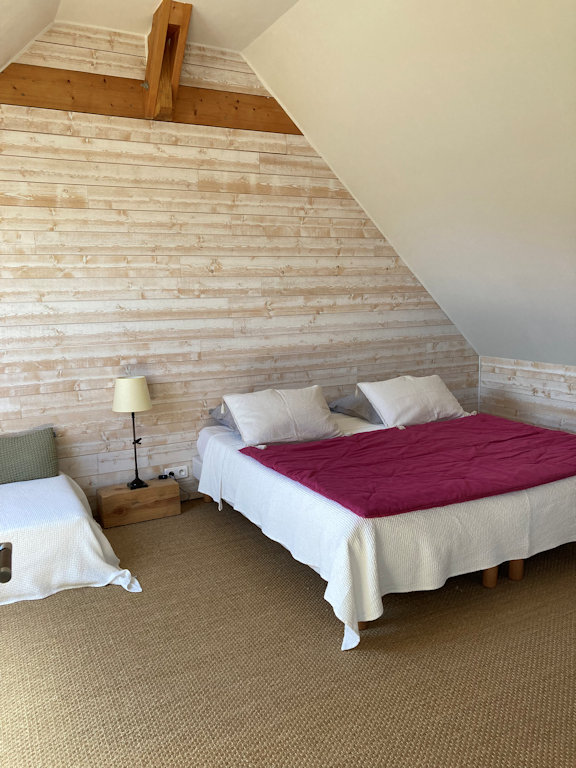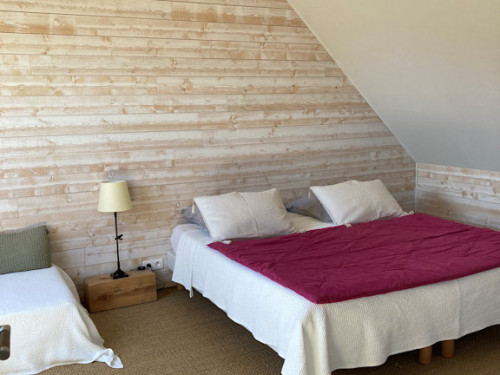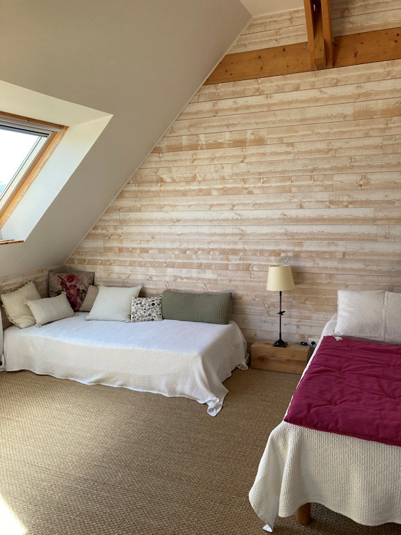 A l'étage la chambre spacieuse, aux couleurs douces vous promet des nuits sereines, bercées par le bruit de la mer...