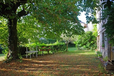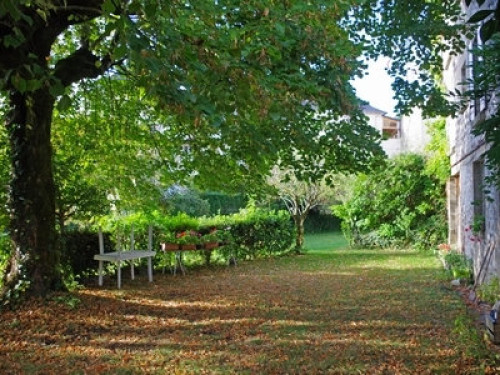 Sous le tilleul majestueux, les salons de jardin et le barbecue et sur la pelouse, les transats.