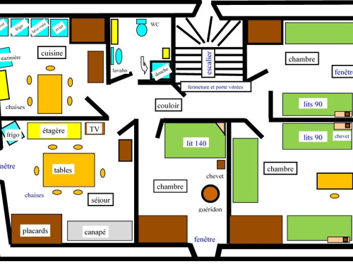 Nous proposons deux appartements meublés simplement mais bien équipés en électroménager, vaisselle, ustensiles cuisine, literie.