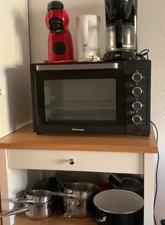 - d’une cuisine ouverte toute équipe avec plaques vitro, lave-vaisselle, frigo congélateur et micro-ondes, grille-pain, cafetière, raclette, gaufrier …chaise haute