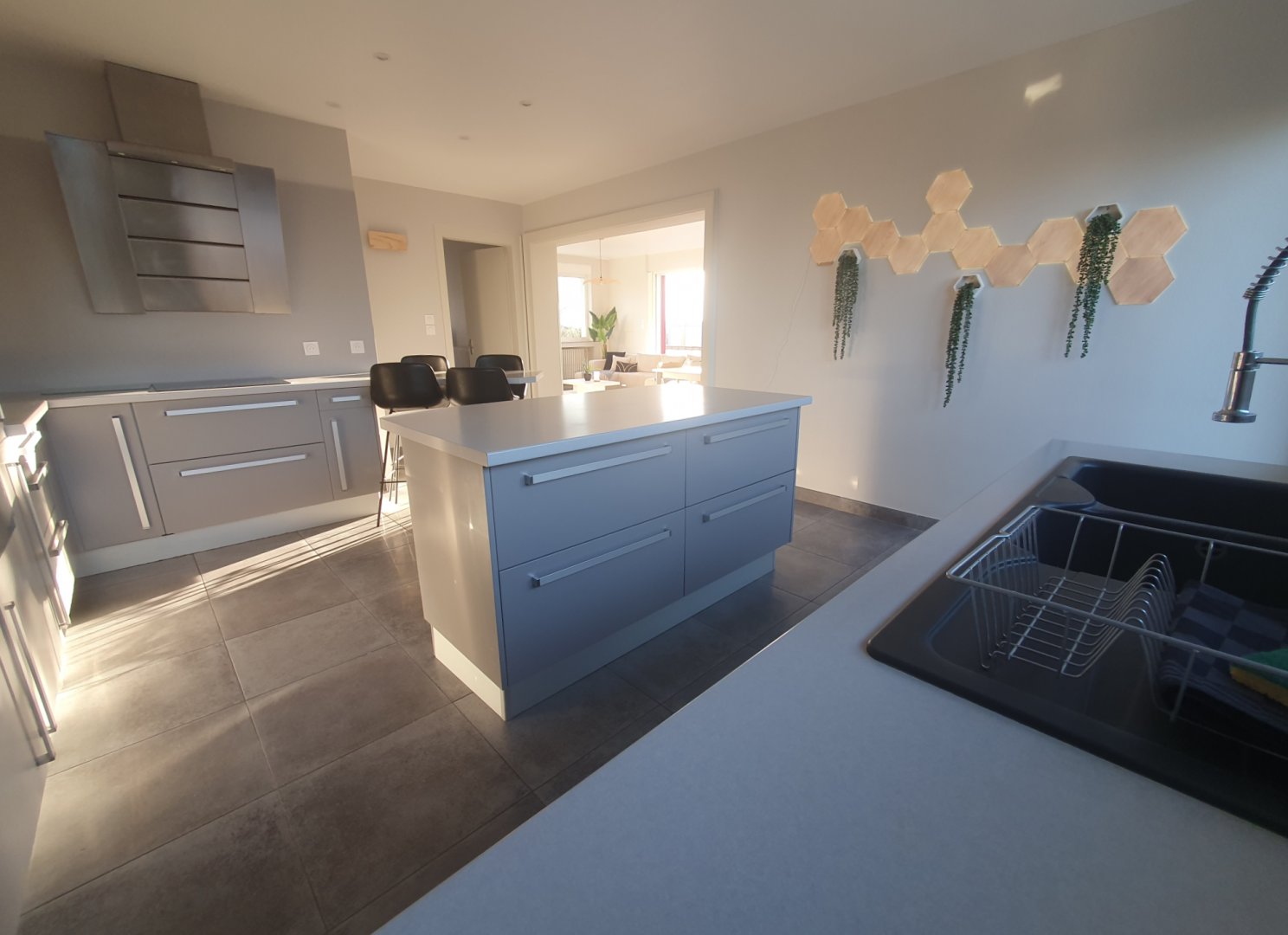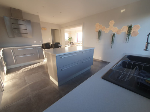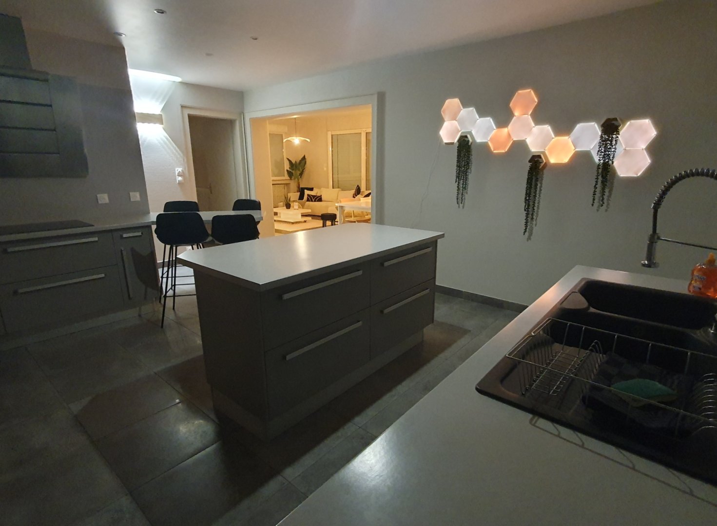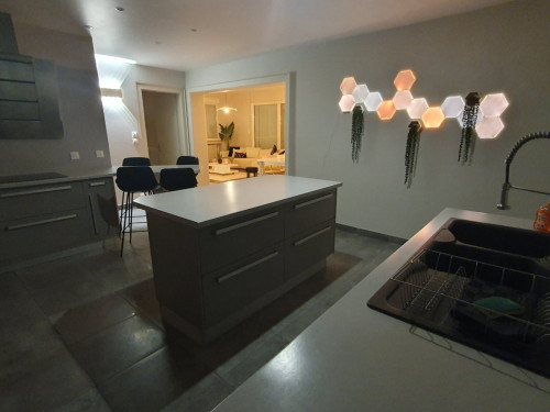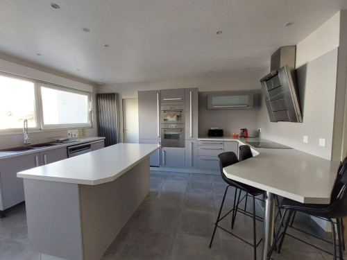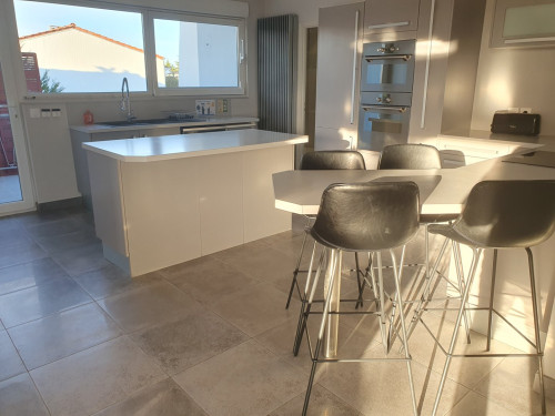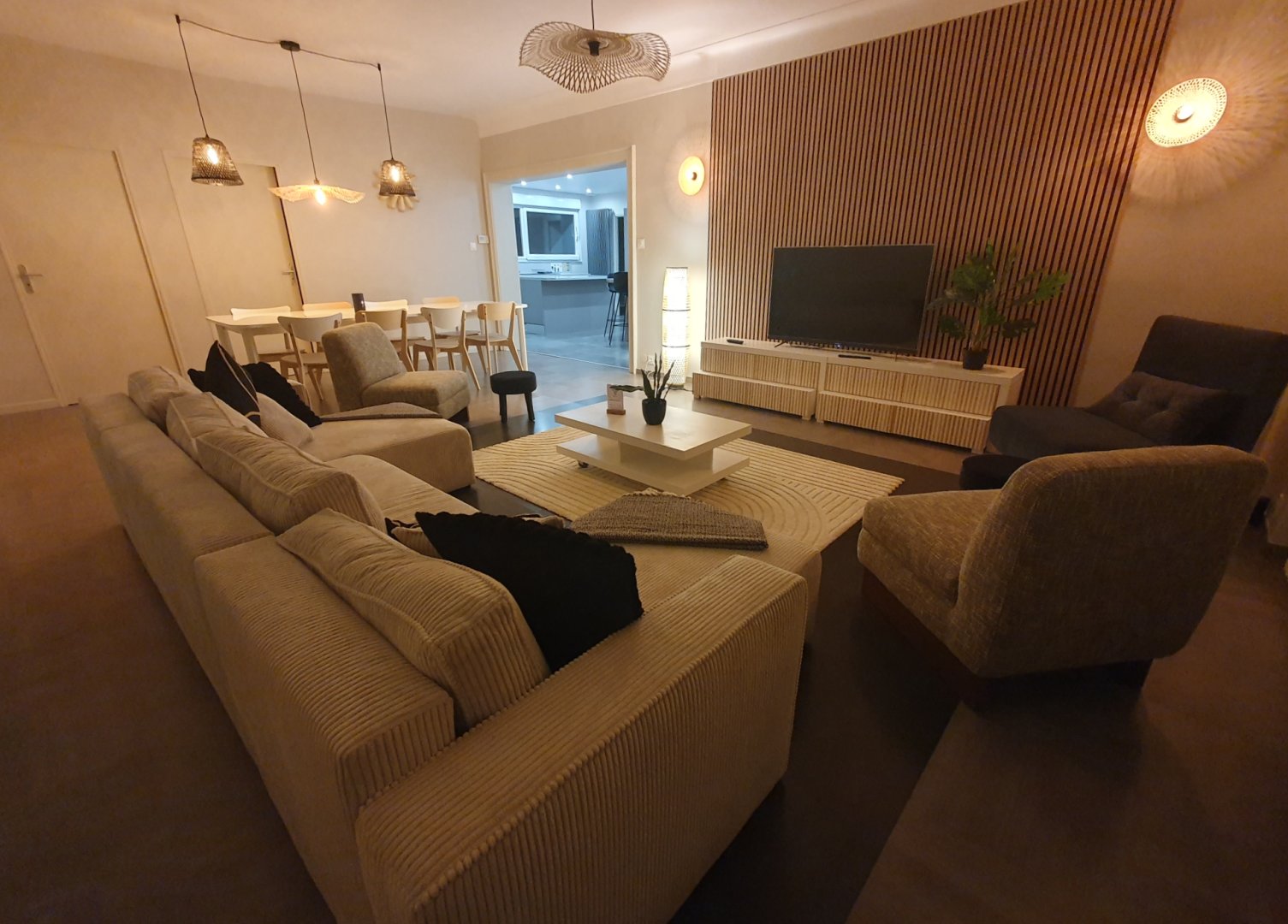 - 1 vaste salon avec canapé et fauteuil convertible donnant sur une terrasse avec baie à galandage , télévision Led de 140 cm, une cuisine entièrement équipée avec four, lave-vaisselle, four micro-onde, réfrigérateur / congélateur, machine à café Nespresso et classique.