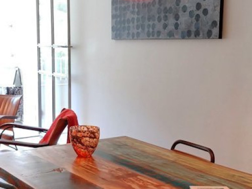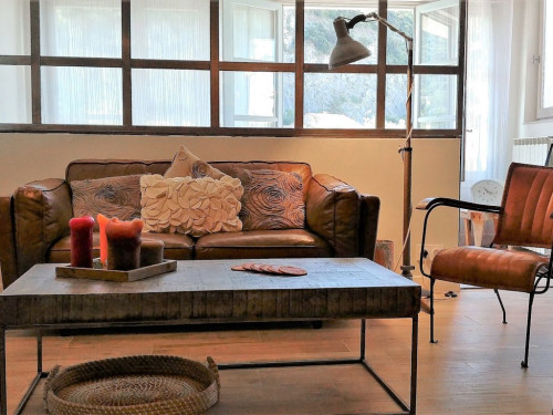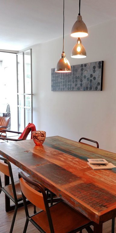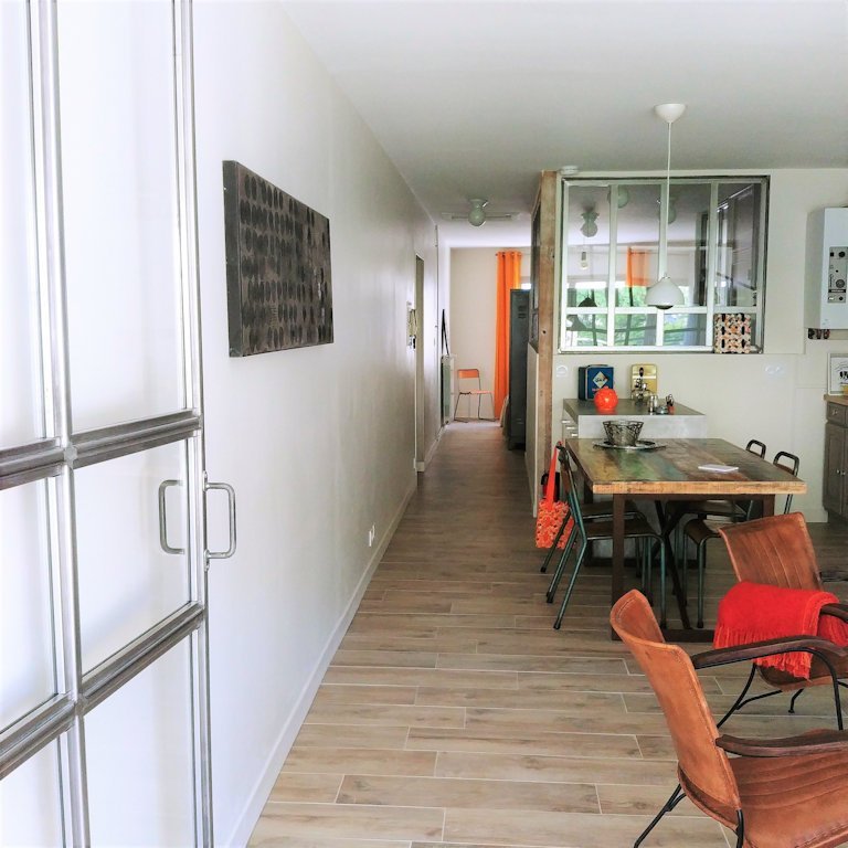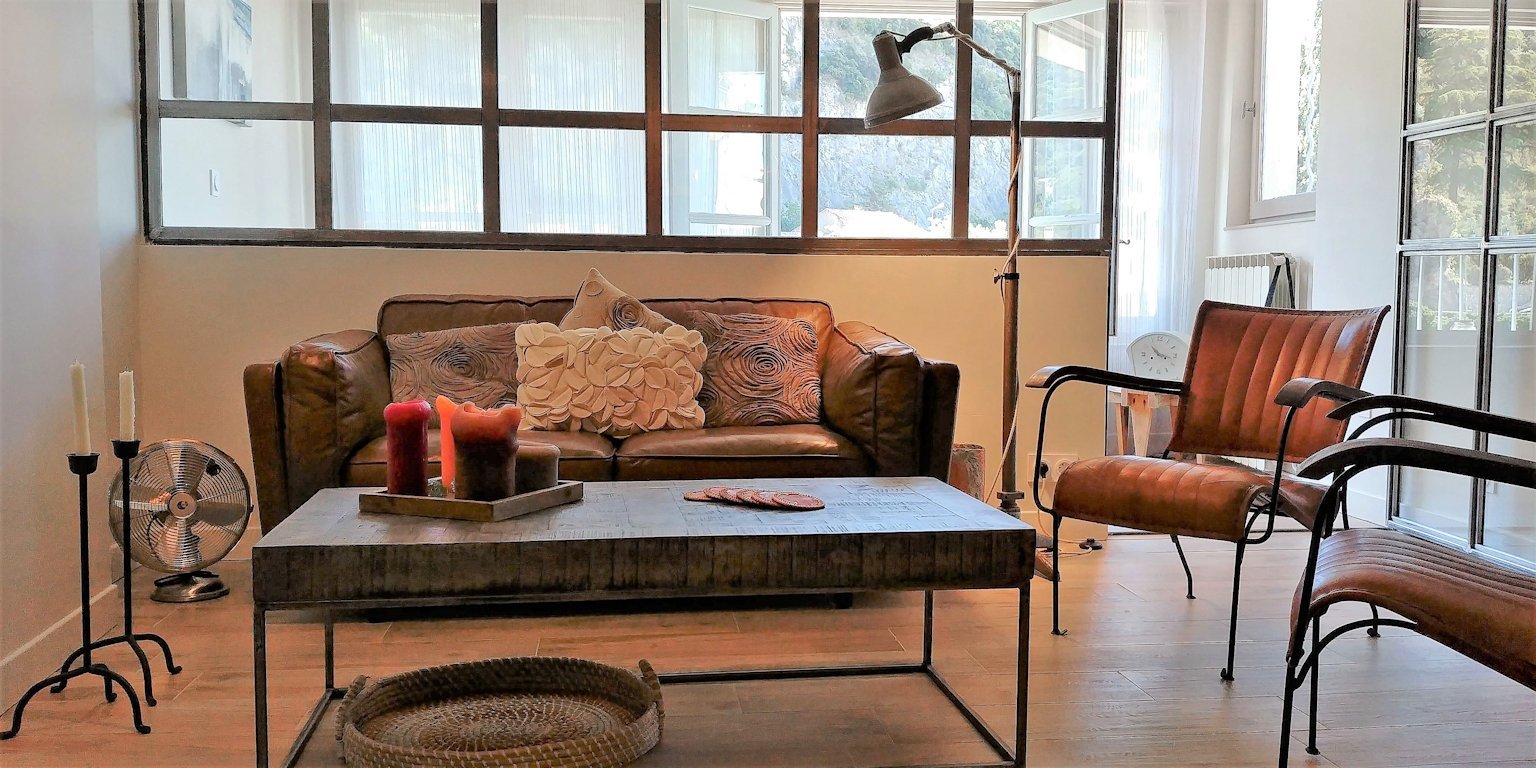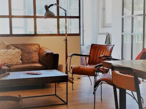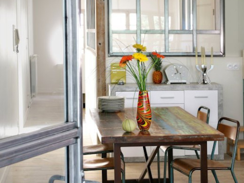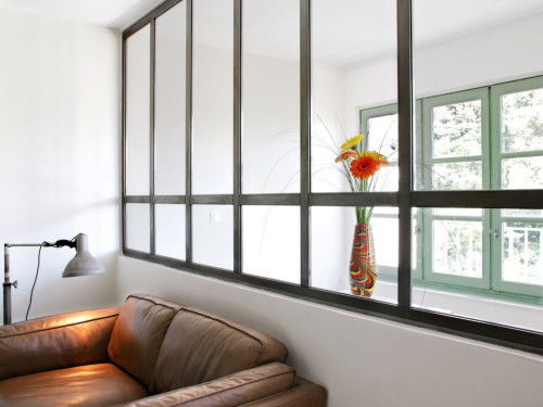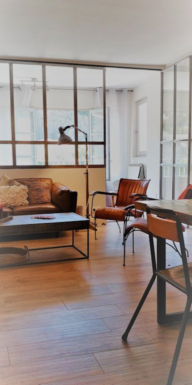 Cet appartement est de style industriel alliant bois, cuir et métal. Ses ouvertures en cadre métallique laisse passer une belle lumière réchauffant ainsi l’ambiance de la pièce.