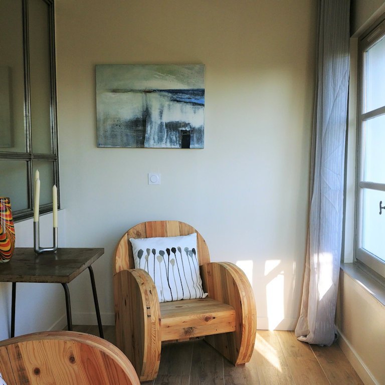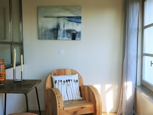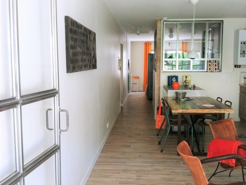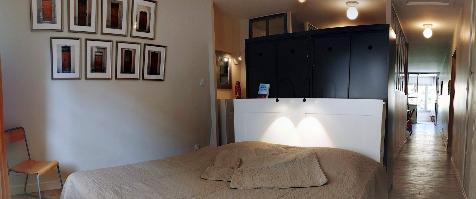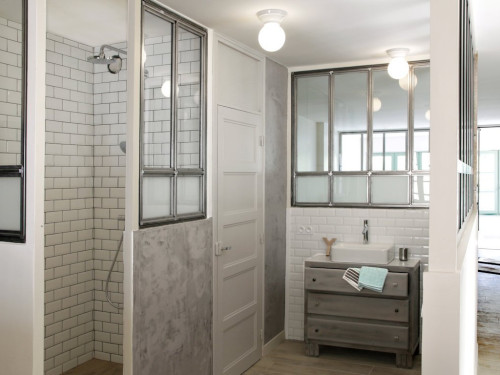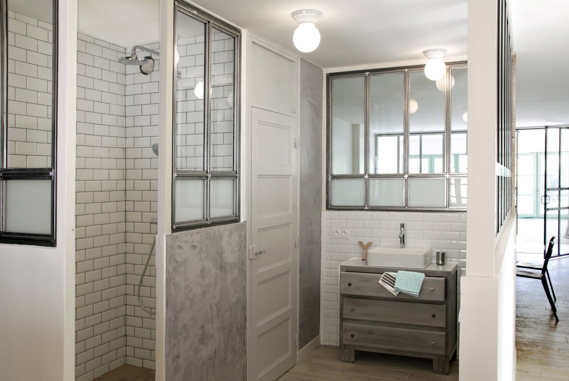 Cet appartement est de style industriel alliant bois, cuir et métal. Ses ouvertures en cadre métallique laisse passer une belle lumière réchauffant ainsi l’ambiance de la pièce.