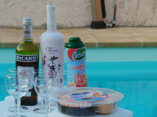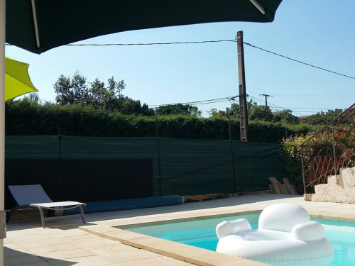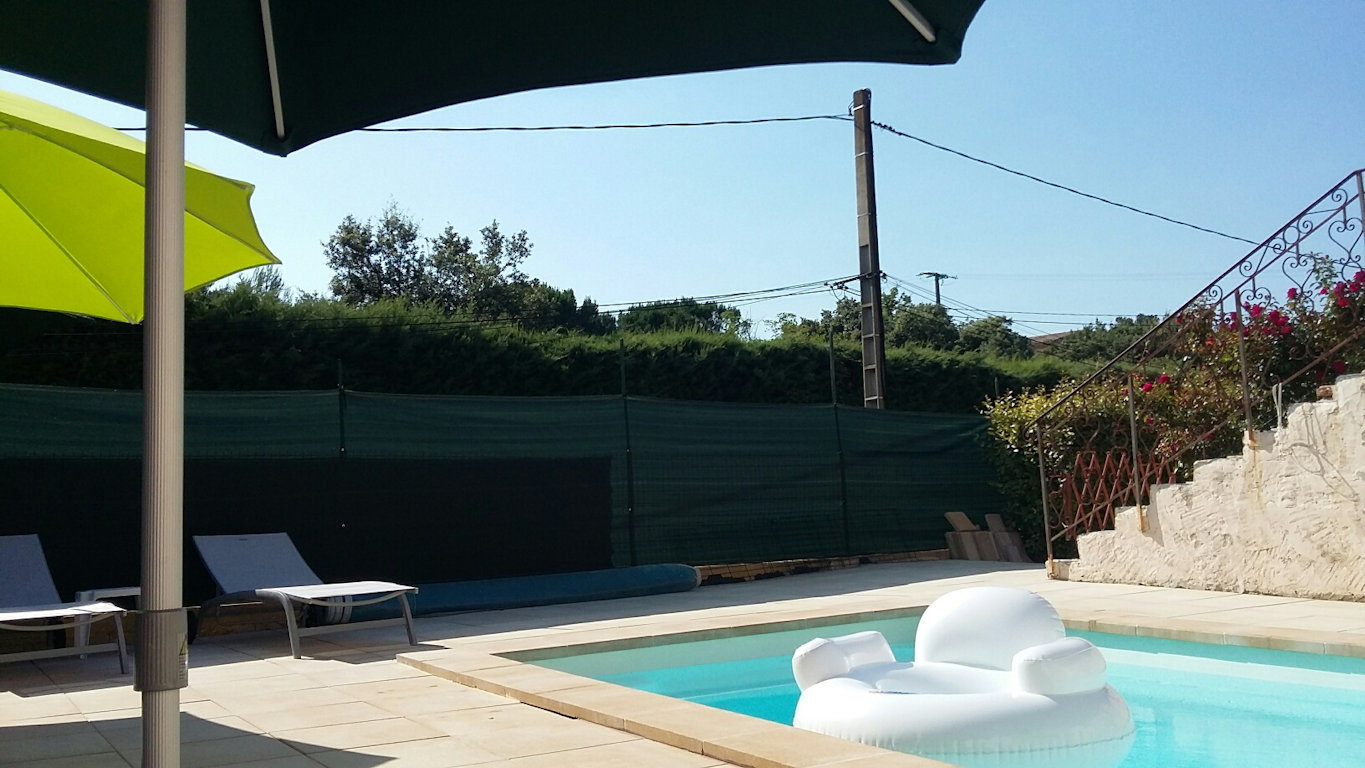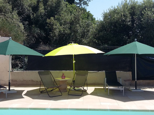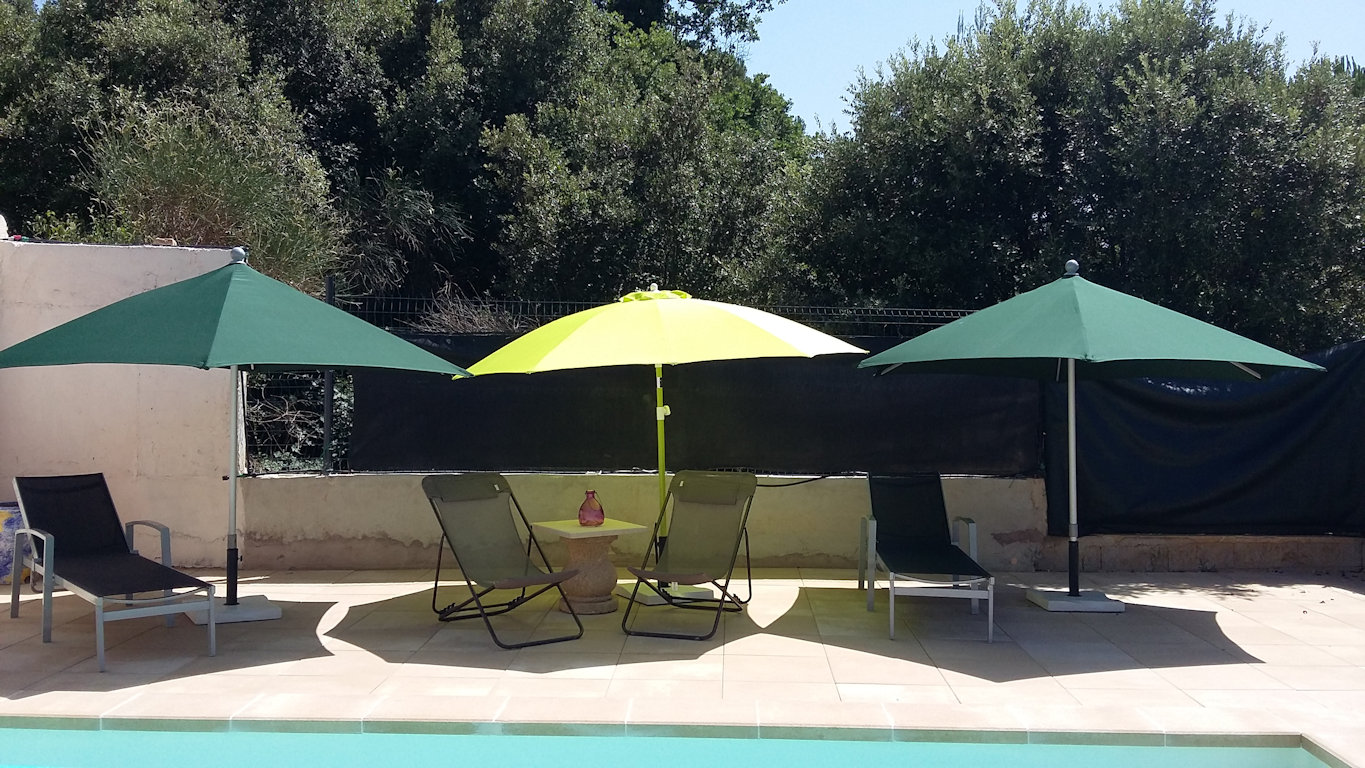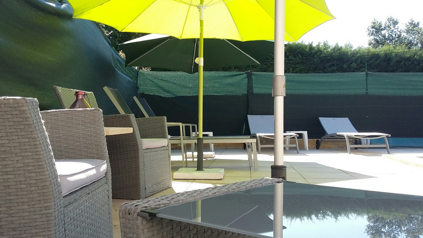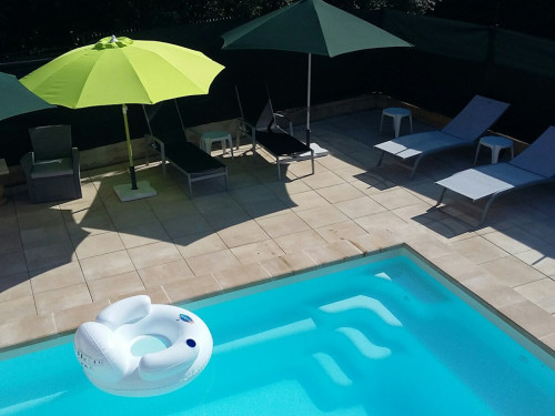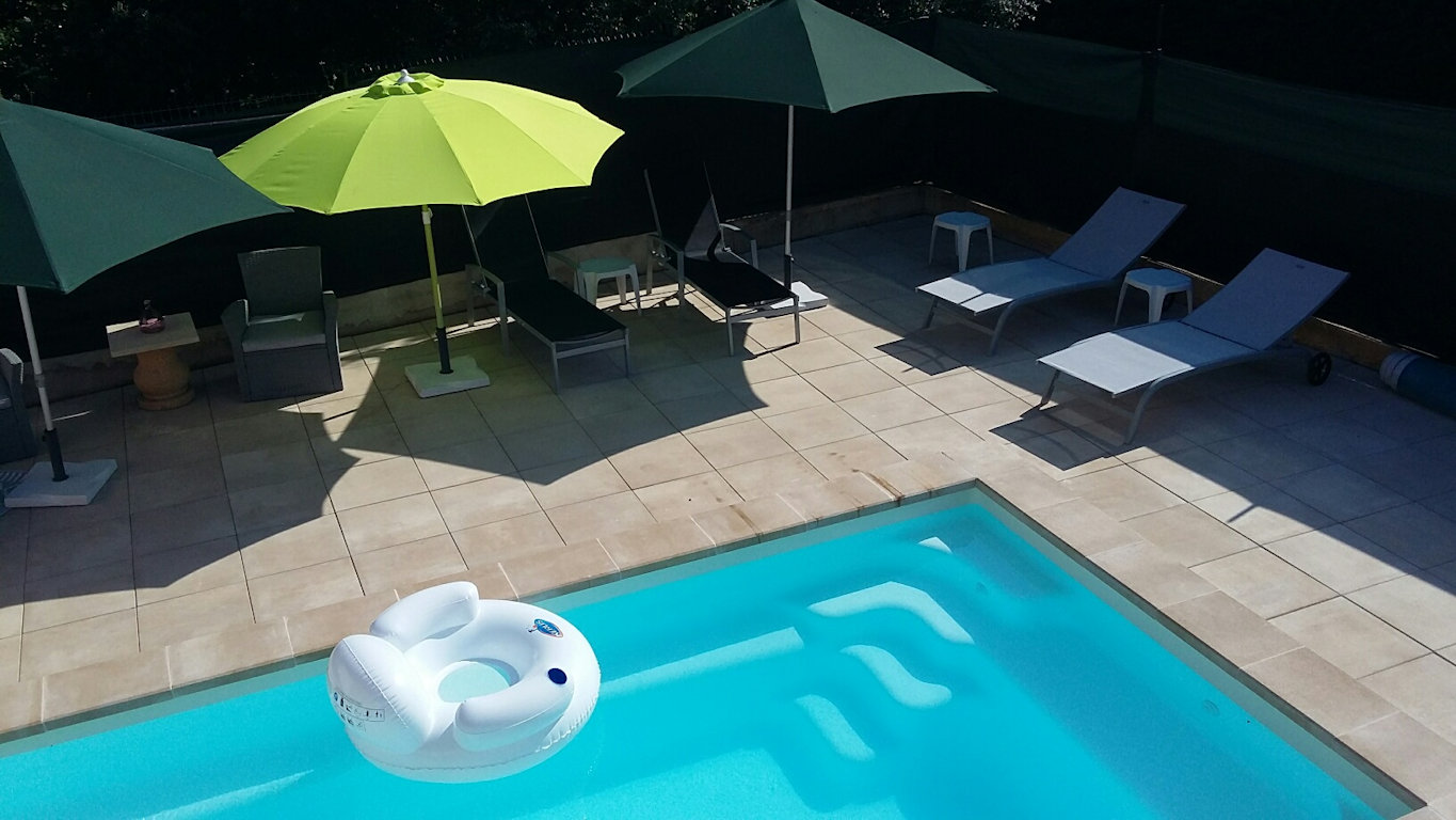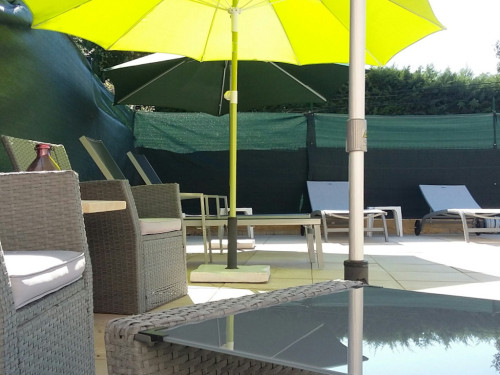 - 1 piscine avec 4 bains de soleil, parasols et salon de jardin