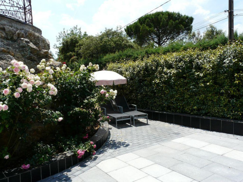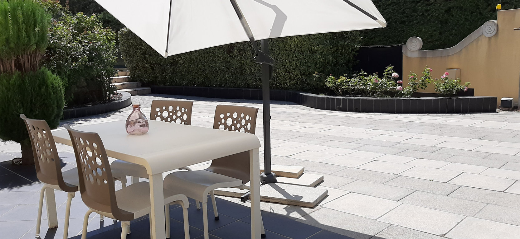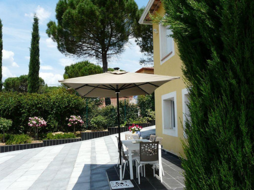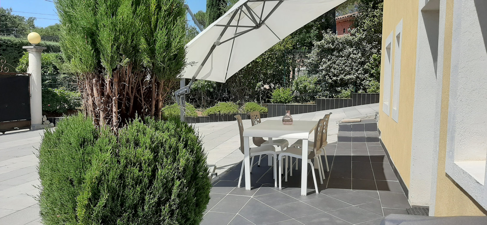 - 1 terrasse avec table, chaises et 1 parasol, 1 plancha et une cour