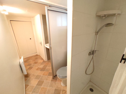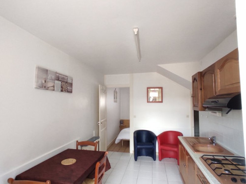 Cuisine équipée ouverte sur séjour, 2 fauteuils, TV - Chambre avec lit double - Salle d'eau en enfilade (douche, lavabo, WC)
