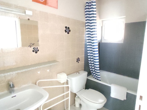 Cuisine équipée ouverte sur séjour, canapé convertible, TV - Chambre avec lit double et salle de bain attenante (baignoire, lavabo, WC)