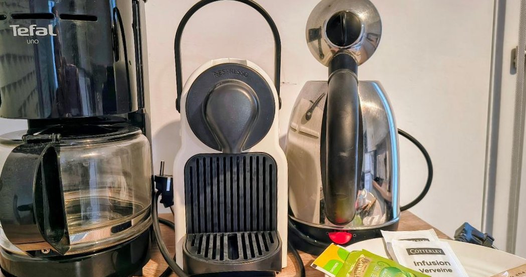 Salon / séjour / cuisine avec grande TV connectée, lave-vaisselle.