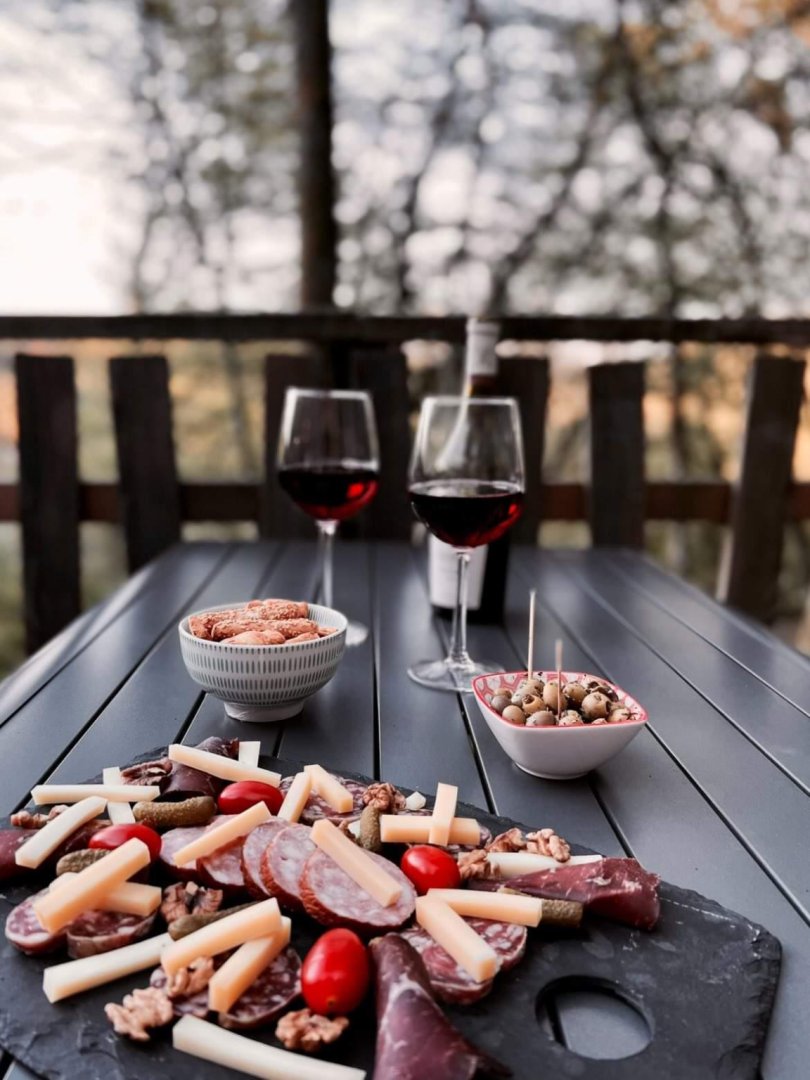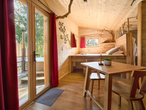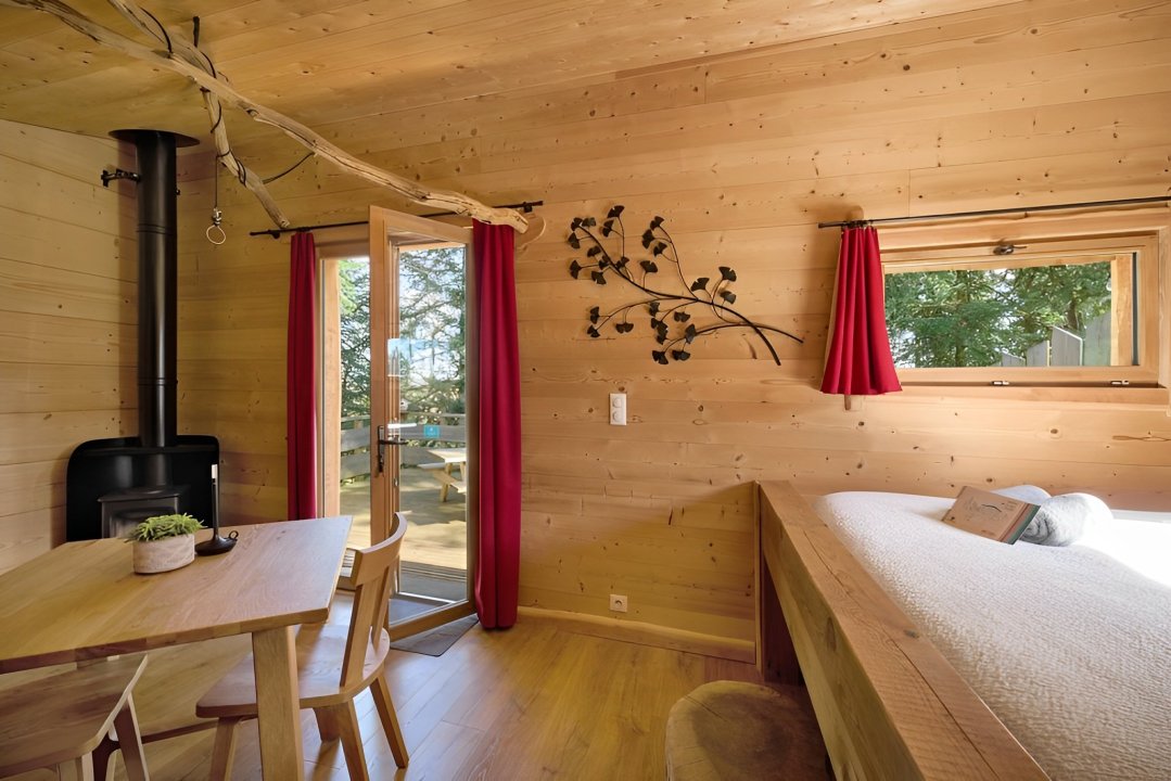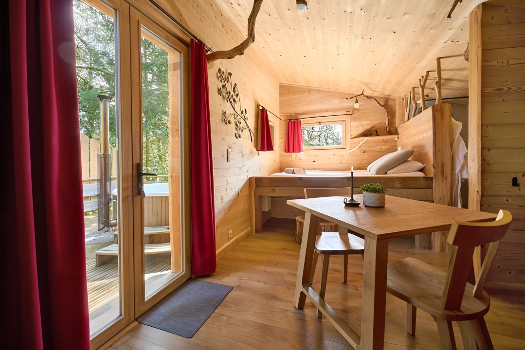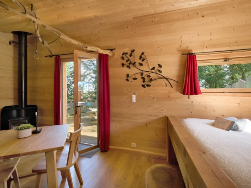 La terrasse sur pilotis donne sur un environnement arboré, offrant calme et intimité. Idéale pour lire, siroter une boisson chaude ou simplement profiter de la vue, la cabane Forsythia est parfaite pour se ressourcer en amoureux.