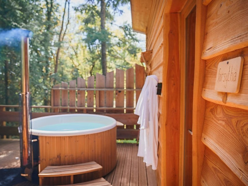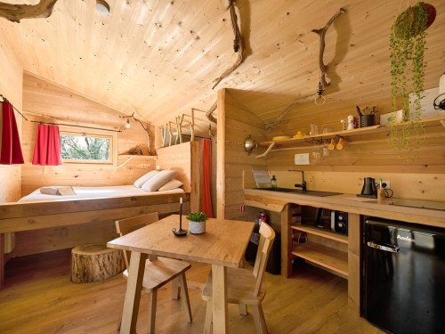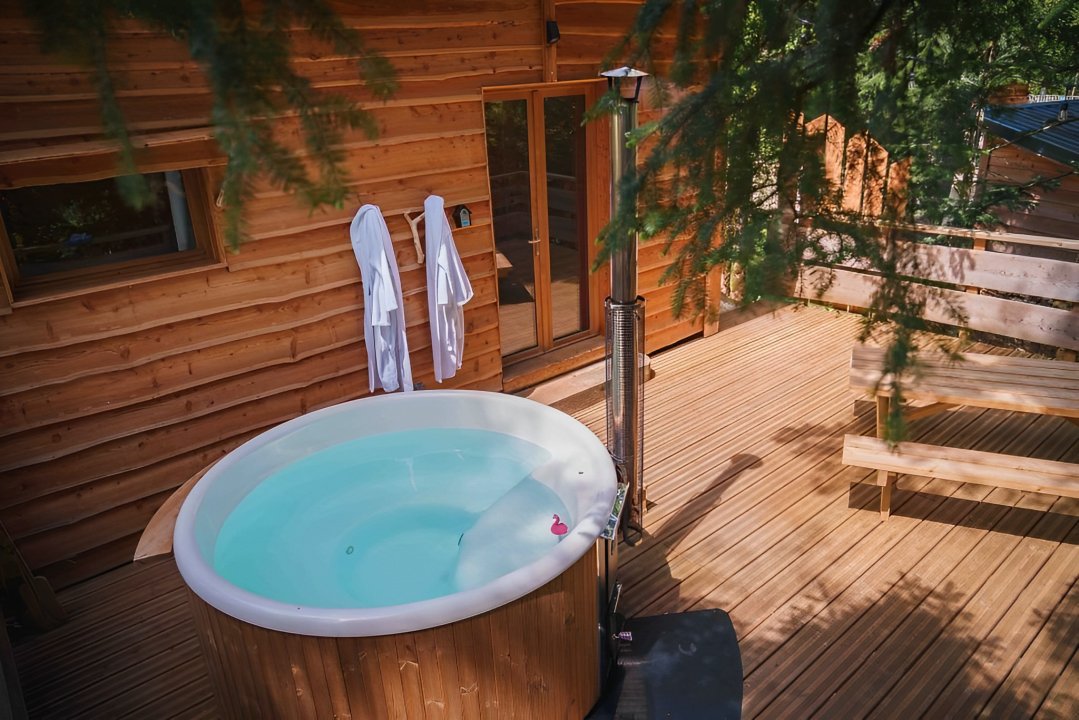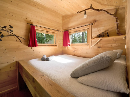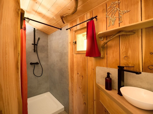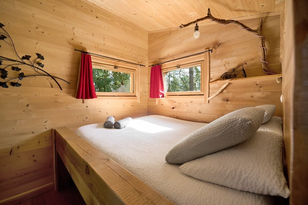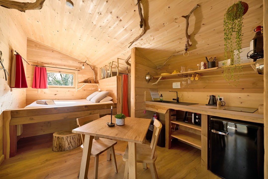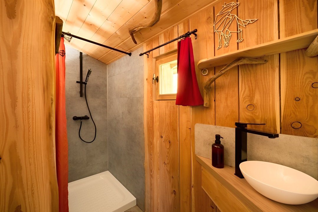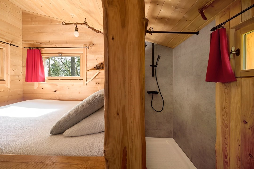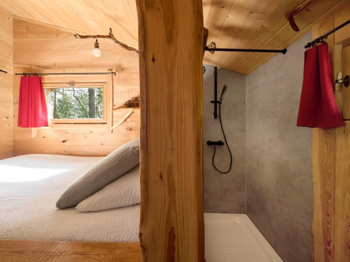 La cabane dispose d'une salle d’eau moderne, d'un WC privatif, d'un coin cuisine pratique, et d'un grand lit Queen size. La pièce maîtresse est son bain nordique privatif chauffé au feu de bois, situé sur une grande terrasse sur pilotis offrant un cadre idyllique pour des moments de détente en toute intimité.