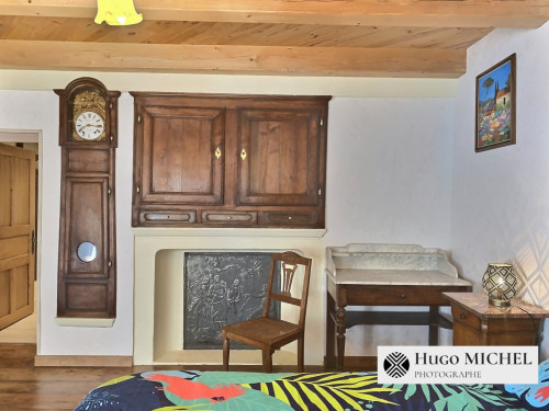 Cette pièce est typique de 1821 (âge de la maison) et possède des placards anciens en bois, une horloge et une vieille cheminée en pierre décorative