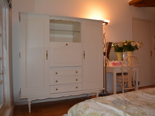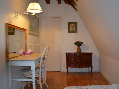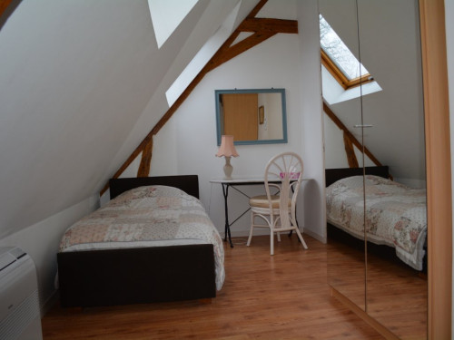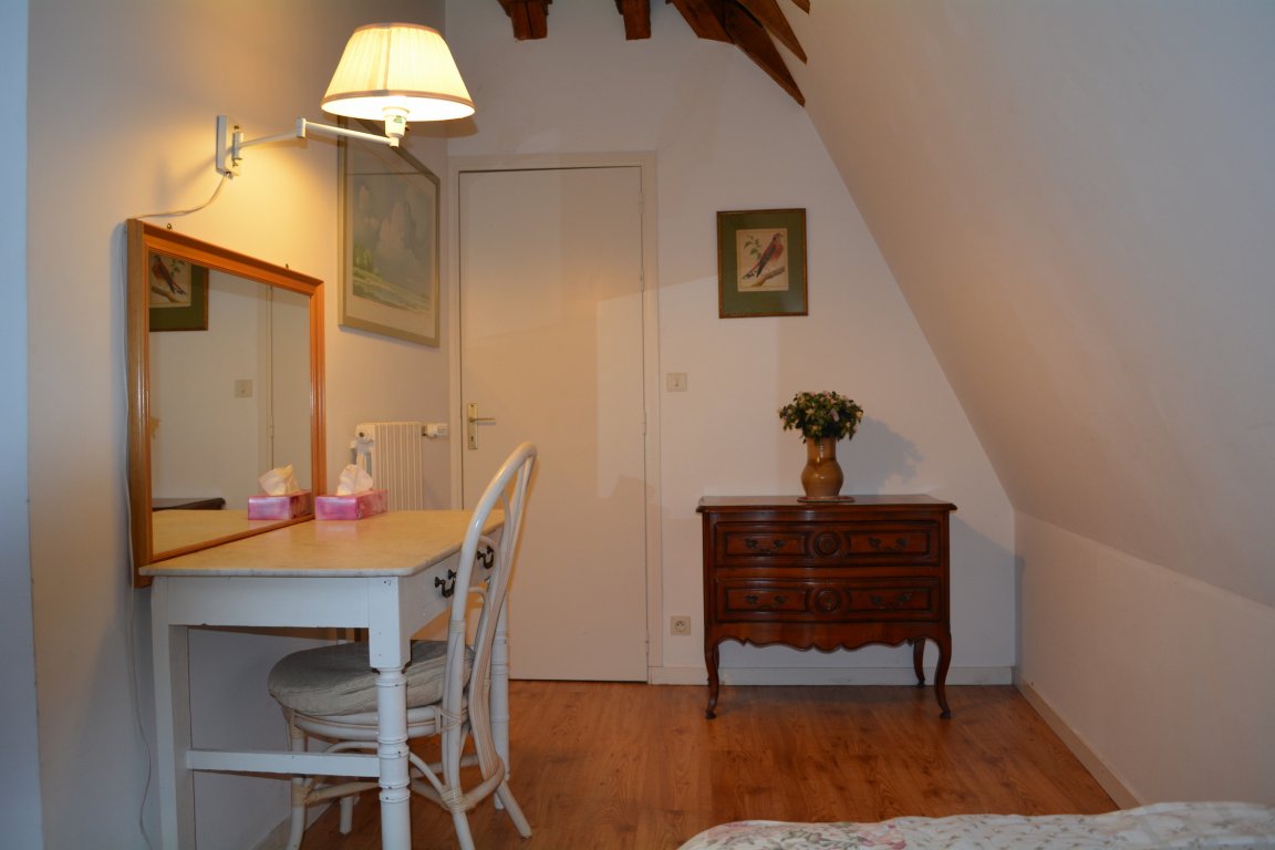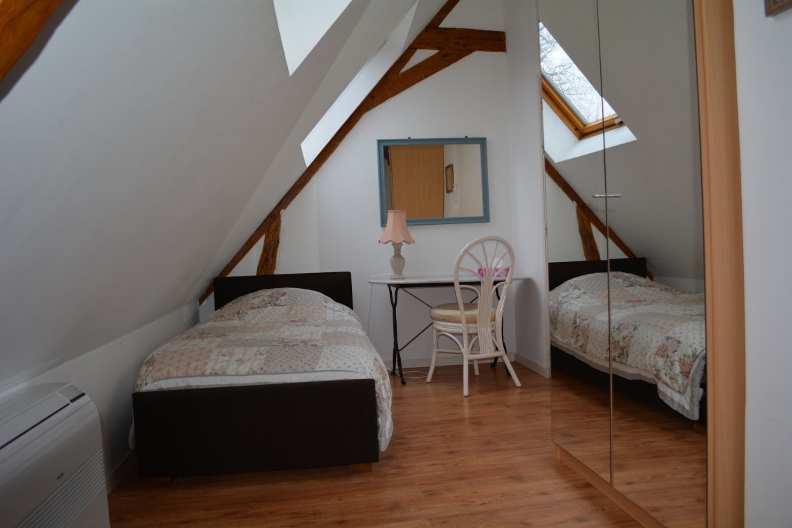 À l'étage, deux chambres dont une parentale avec salon indépendant et une avec deux lits simples. Salle de bains commune, deux WC.