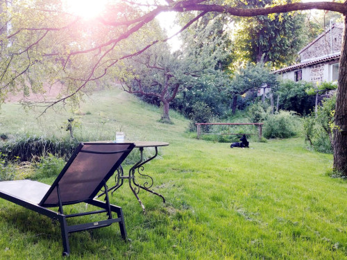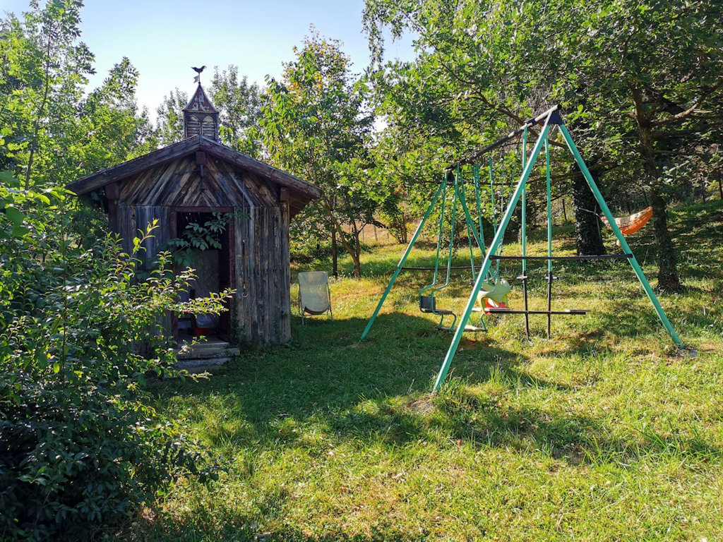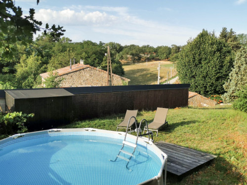En extérieur une terrasse ombragée, une terrasse plein soleil, le jardin (1 hectare) aux ambiances naturelles et variées, une piscine hors sol de 3,70m par 1m de hauteur (partagée avec les propriétaires), des balançoires, une cabane…