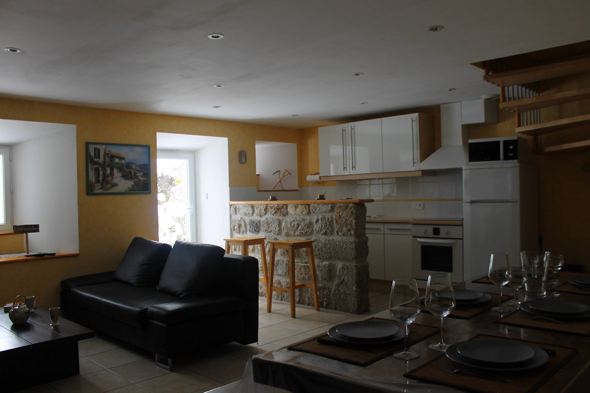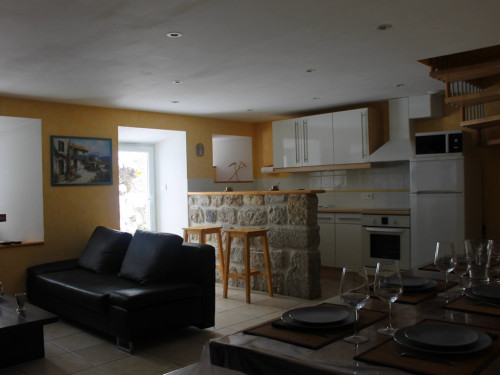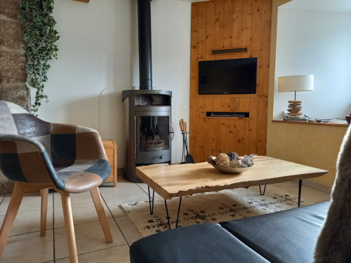 Salon Séjour : 1 canapé convertible (140cm) / chauffage au sol, poêle à bois (bois + allume feu fourni) / TV / lecteur DVD, Div-X / DVD pour enfants / radio cd usb bluetooth / magasines / jeux de société.