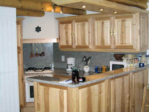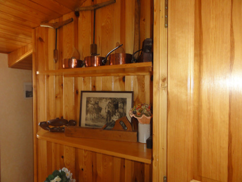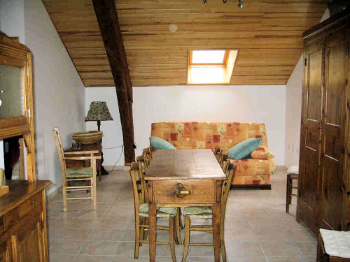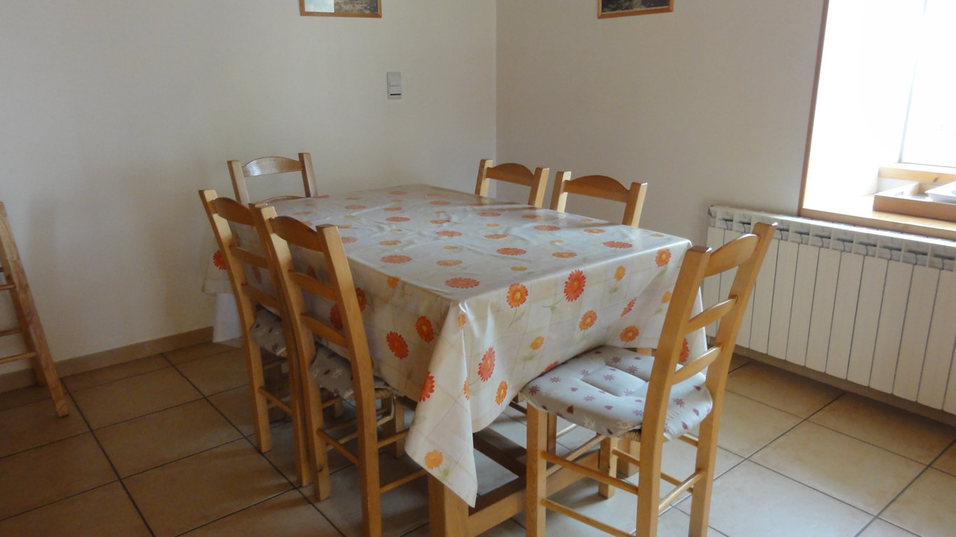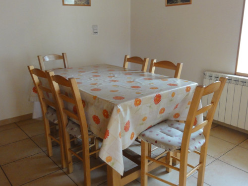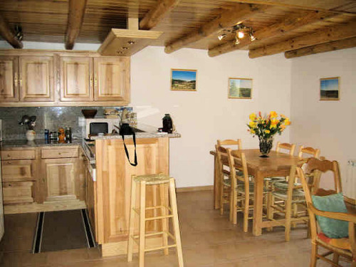 Au rez de chaussée : coin cuisine équipée, coin repas et salon avec canapé confortable, et fauteuils, face à une vraie cheminée. Télévision, WC et lavabo.