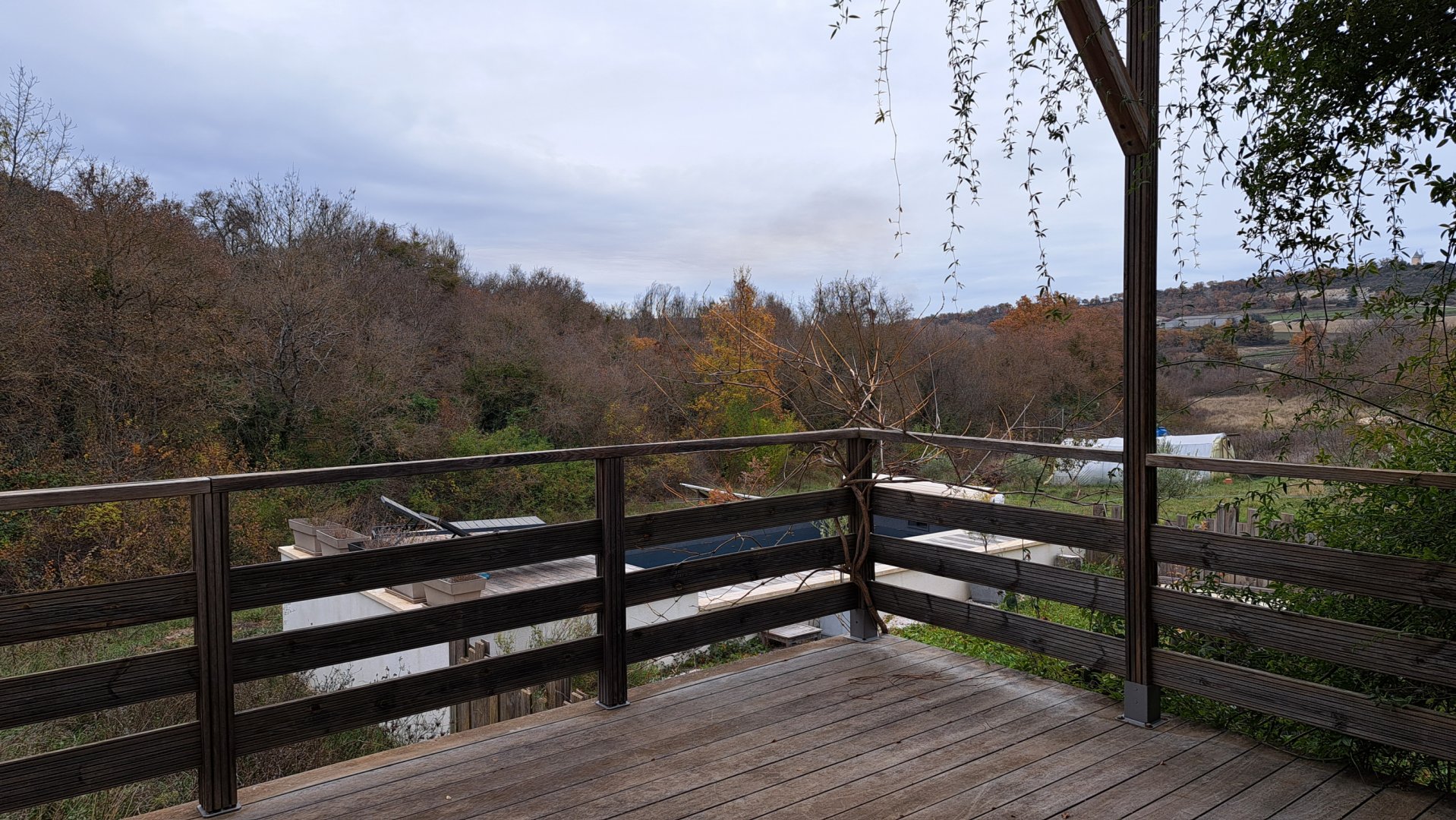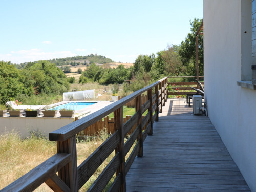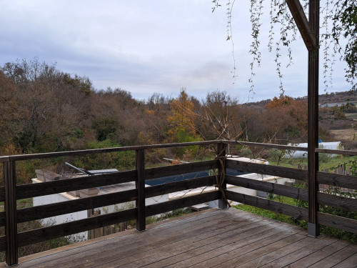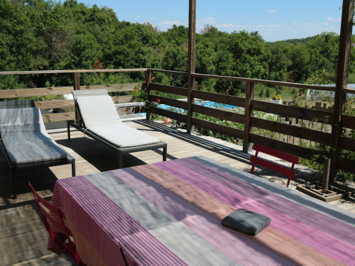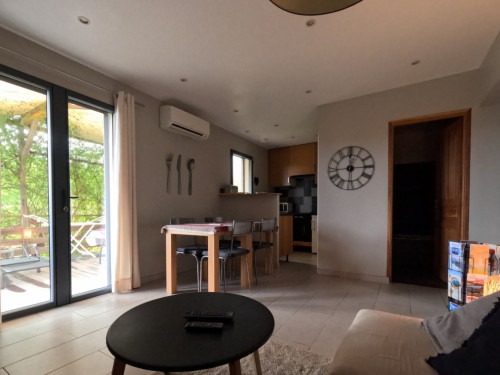 Le gite dispose d'une grande terrasse en bois, couverte par une toile d'ombrage et des plantes grimpantes. Vous y trouverez une table, des chaises et deux bains de soleil.