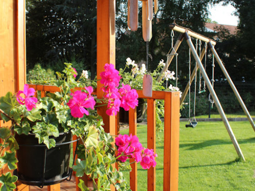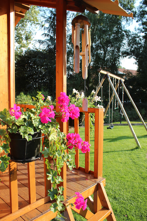 Un espace en gazon avec une aire de jeux est à la disposition des enfants.
