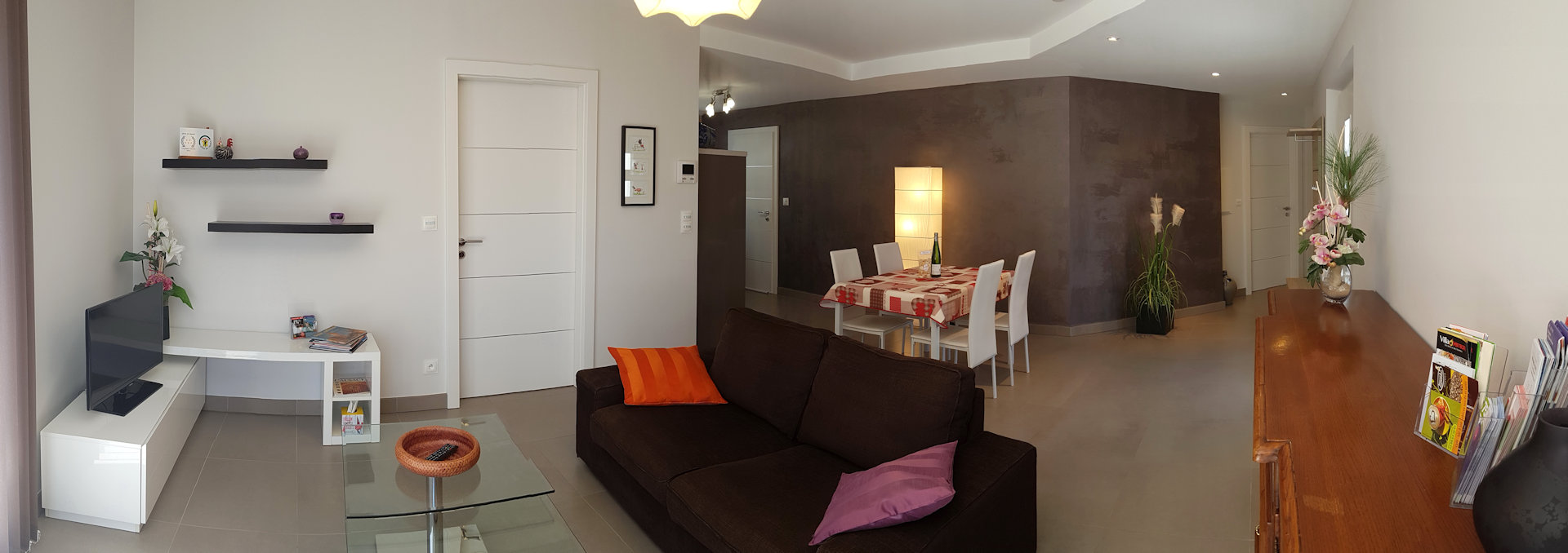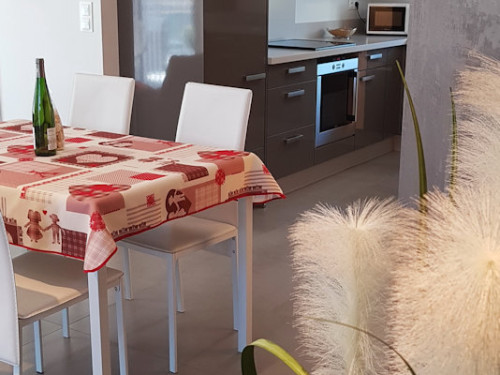 - 1 séjour avec cuisine équipée ouverte (micro-ondes) donnant sur une terrasse de 25 m² (salon de jardin, table et chaises, parasol, bain de soleil, barbecue)
