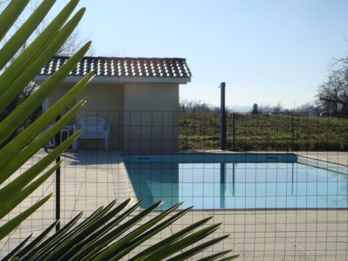 Grand jardin et grande piscine à partager avec un autre gîte mitoyen mais indépendant, entrée, cour et parking privés.